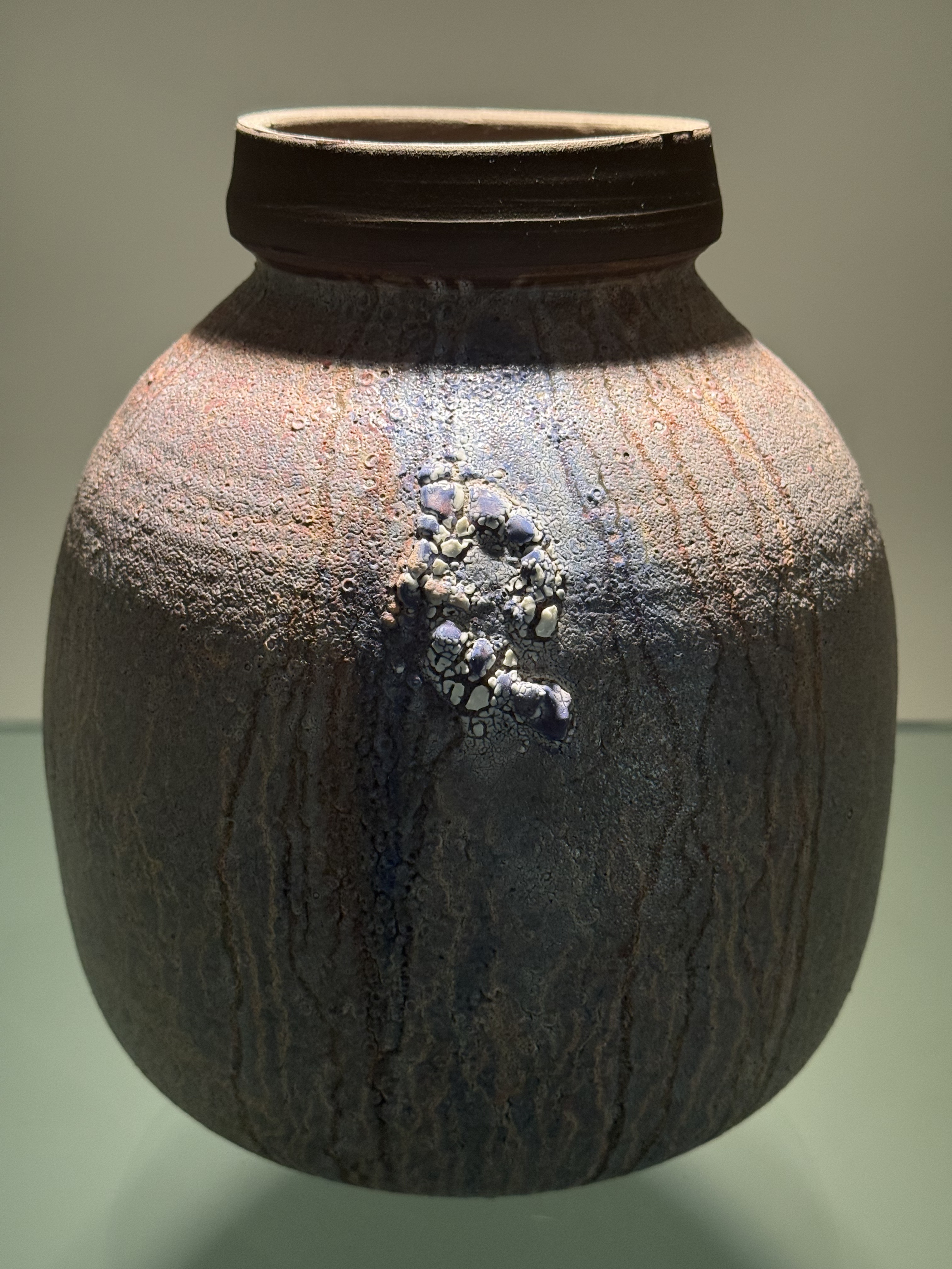 His relationship to those traditions is one of genuine conversation rather than imitation, a dialogue conducted through his own hands and his own materials. The most immediately striking quality of Silverman's mature work is his approach to glaze. He has developed a body of experimental glaze formulas that produce surfaces of extraordinary complexity, surfaces that crawl, pool, blister, crystallize, and stratify in ways that seem to document the firing process as a kind of natural event. Looking at an Untitled vessel from 2014, one of his signature stoneware works, the glaze reads almost like aerial photography of a landscape seen from altitude, with ridges and valleys and accumulations of mineral color that feel less manufactured than discovered.