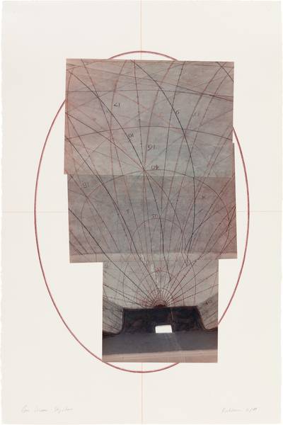 The vellum surface catches light differently depending on the angle of viewing, giving the work a quiet animation that rewards slow looking. Vesper, from 1987, realized in colored pencil on folded paper on rag board, captures the devotional quality that increasingly entered her work as she turned her gaze toward astronomy and the spiritual traditions that have always sought meaning in the stars. Oxymoron, also from 1987, rendered in oil on gessoed linen, demonstrates her equal command of the painted surface, with its tensions between transparency and opacity echoing the paradox embedded in its title. Open Sesame: Sky Chart, a photograph collage and colored pencil drawing on Saunders paper, reveals Rockburne at her most cosmological, mapping relationships between the earthly and the celestial with the confidence of someone who has spent decades learning to read the night sky.