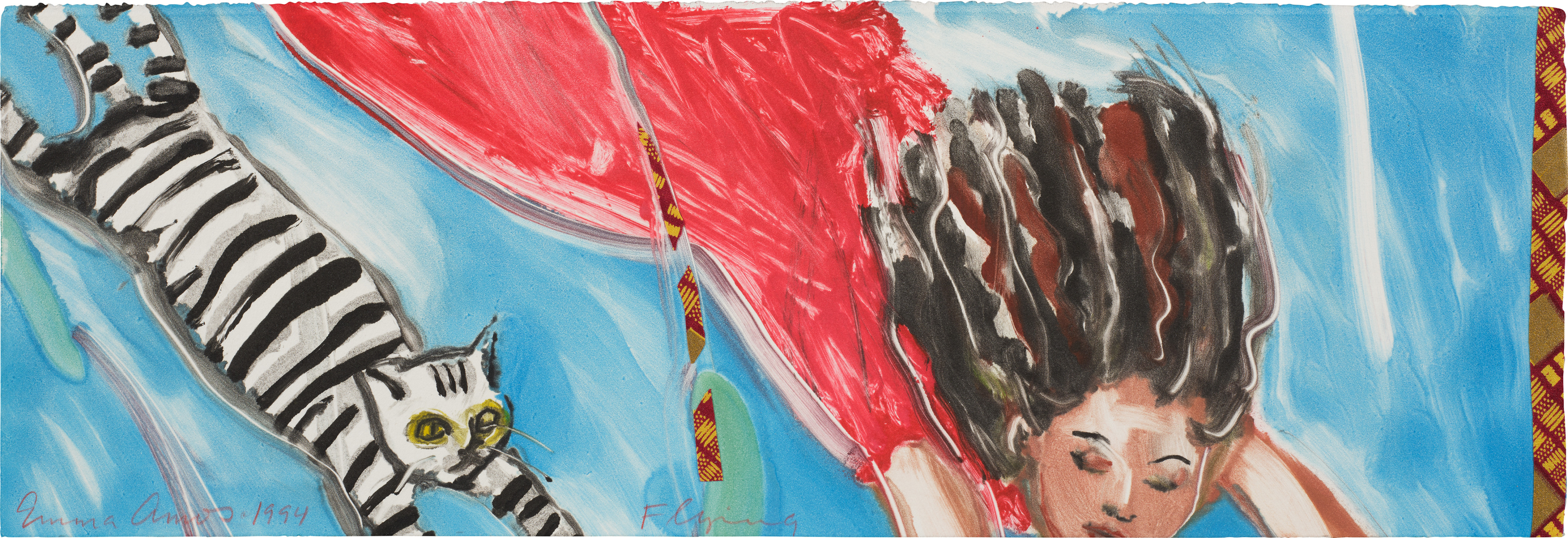 Emma Amos (1937, 2020) was an American painter and printmaker known for her vibrant, figuratively grounded work that boldly confronted issues of race, gender, and identity. A member of the groundbreaking Spiral group in the 1960s, the only woman in the collective, she later developed a distinctive style combining painted figures with textile borders and woven African fabrics, challenging the hierarchies of both the art world and American society. Her work has gained significant posthumous recognition as a vital contribution to feminist and African American art history.