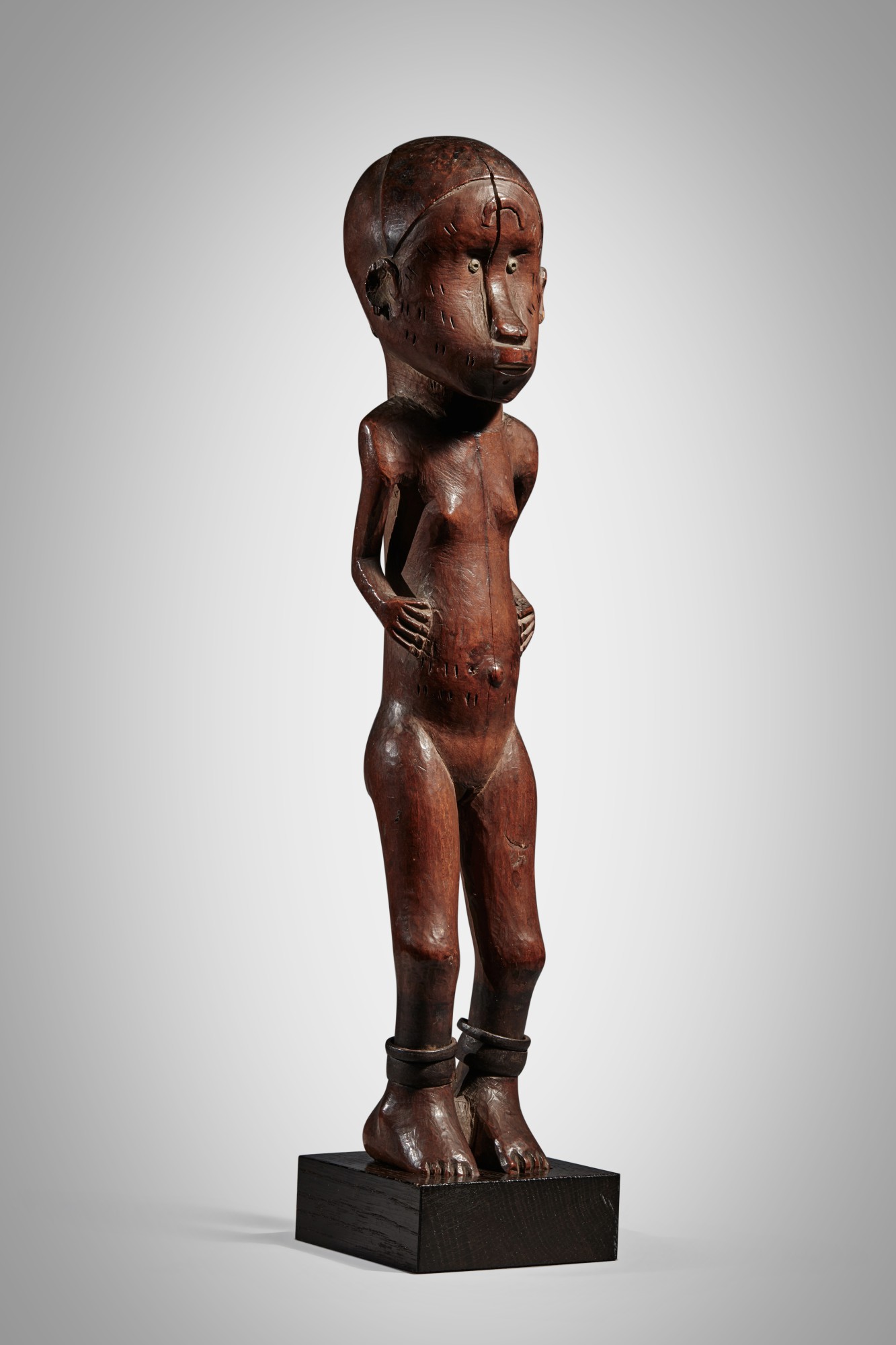 'Female Figure, Tanzania' refers to an anonymous or unattributed work of traditional African sculpture originating from Tanzania, representing the broader tradition of figurative carving practiced across the region. These figures, often created by Makonde, Zaramo, or other Tanzanian peoples, served ceremonial, ritual, or communal purposes within their cultures. The works are typically sold at auction without a known individual artist attribution, classified instead by region and subject matter.