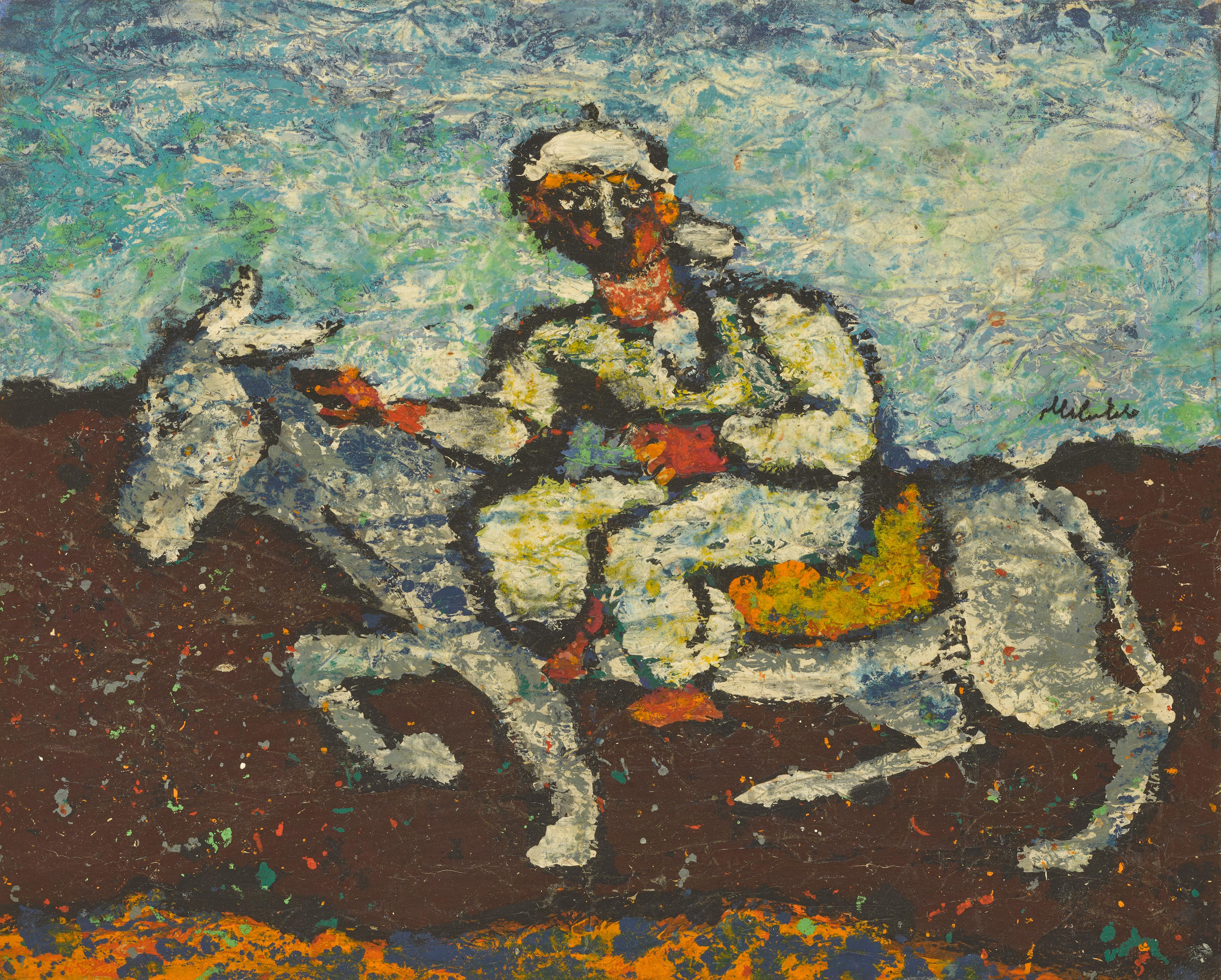 Hamed Abdalla was an abstract painter and theorist who developed 'Hurufiyya,' an artistic movement integrating Arabic letters and calligraphy into modernist abstraction. His politically engaged works addressed Pan-Arabism and anti-colonial struggle through fragmented text and gestural forms. His paintings are held in collections including the Barjeel Art Foundation and the Arab World Institute in Paris.