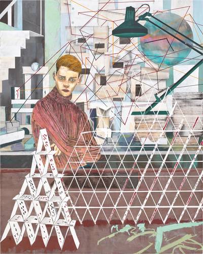 His artistic development accelerated through the early 2000s, a period when he established the visual grammar that would define his practice. Working initially on paper with gouache, acrylic, and mixed media, he populated his compositions with solitary young men, dandyish figures who seem caught between worlds, belonging neither entirely to the natural settings they inhabit nor to any legible social category. A work like The Last Song from 2005, rendered in a remarkable mixture of gouache, acrylic, metallic acrylic, charcoal, pastel, graphite, ink, and neon paint on paper, demonstrates the ambition of his material thinking even in this early moment. The surface practically hums with competing energies, the neon paint introducing something almost spectral into what might otherwise read as a romantic scene.