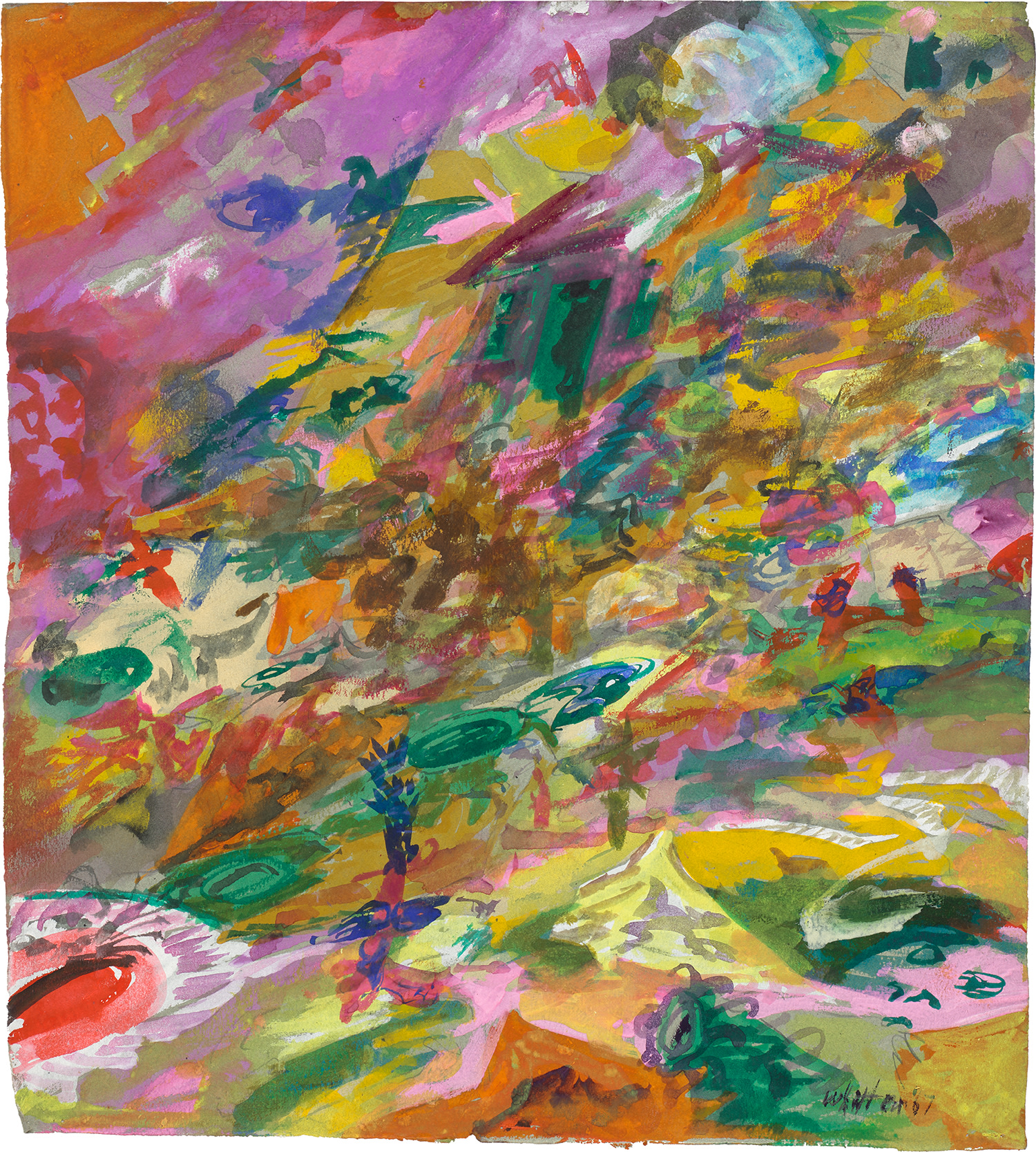Yet even in this charged territory, Whitten's formal intelligence never flags. The surface is a thing of intricate beauty even as its content unsettles, and that tension, between sensory pleasure and moral weight, is the signature of his greatest work. A Gift to Ornette, a watercolor from 1967 dedicated to the jazz iconoclast Ornette Coleman, points to another dimension of Whitten's intellectual life: his profound engagement with jazz, not as metaphor but as structural model, as a way of thinking about improvisation, tradition, and rupture all at once. For collectors, Whitten represents one of the most rewarding figures to engage with at any level of the market.