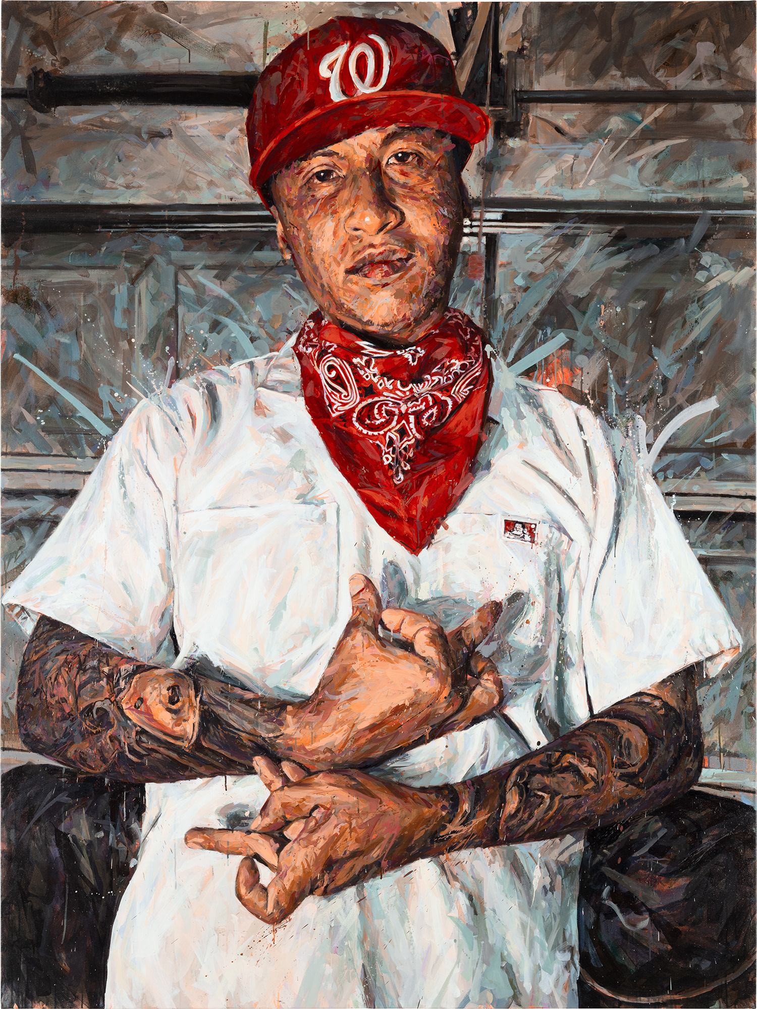 Miami-based artist Michael Vasquez is known for his visually dense, street art-influenced paintings that blend portraiture, graffiti aesthetics, and pop culture references. His work often explores themes of identity, urban life, and the intersection of high and low culture through bold color palettes and layered imagery. Vasquez has gained recognition in the contemporary art market, with his works appearing at major auction houses including Phillips.