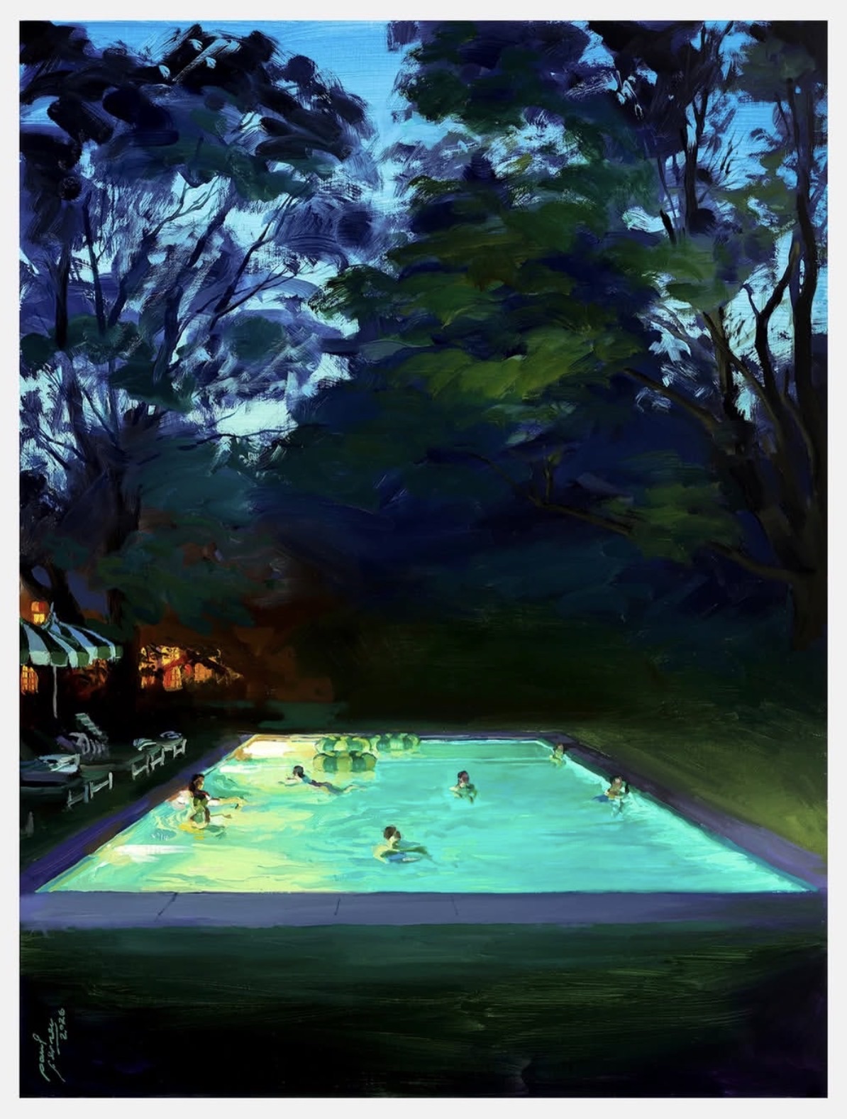Playful typography woven into his compositions nods to the hand lettered signs and broadsides of American vernacular culture, giving his work a literary dimension that rewards close looking. His color palette, warm and luminous without ever tipping into sentimentality, is one of the most immediately pleasurable things about spending time with his pieces. "Moonlight," painted in oil on linen panel and dated 2026, offers a compelling example of where Ferney's practice currently stands. Oil on linen is a material choice with deep art historical resonance, and the decision to work in this medium speaks to an artist who takes the physical and historical dimensions of painting seriously even while his imagery remains rooted in the personal and the intimate.