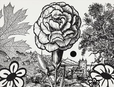 Morrison works at a scale that transforms his source material entirely. A flower or leaf lifted from an eighteenth century botanical plate, blown up to fill a canvas several metres across and rendered in stark black and white, ceases to be decorative and becomes something else altogether, something that hovers between the familiar and the uncanny. His technique draws on the bold outlines and flat graphic quality of cartoon illustration, so that his compositions feel simultaneously naive and knowing, playful and serious. This blurring of registers is entirely deliberate.