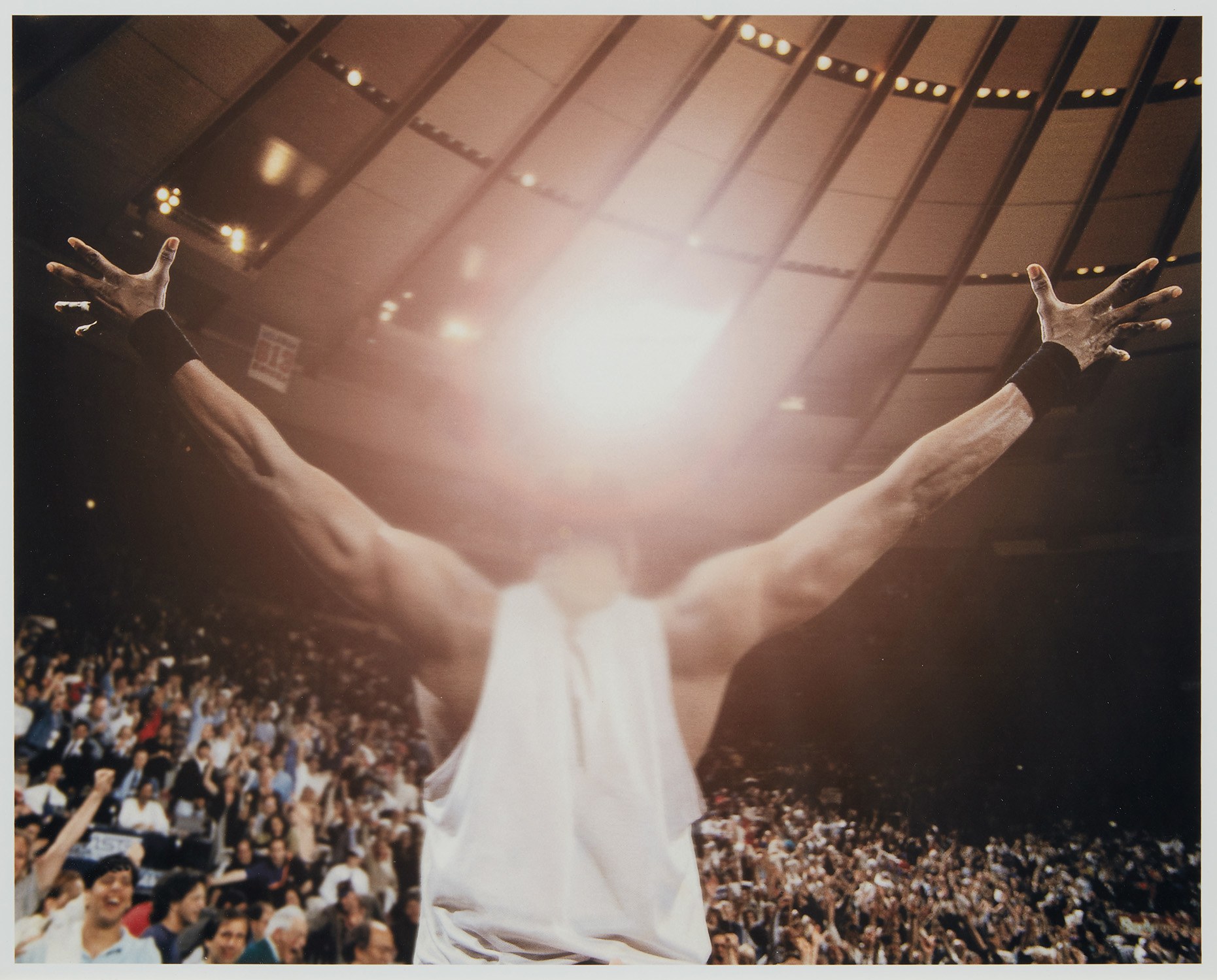 The "Four Horsemen of the Apocalypse" series, several works from which are available through The Collection, represents one of the most sustained and formally ambitious bodies of work in contemporary photography and video. Drawn from manipulated imagery of basketball games and large scale crowd events, these monumental chromogenic prints isolate figures, multiply them, and arrange them against fields of artificial light and amplified color. The effect is simultaneously ecstatic and unsettling, like staring at a religious icon that has been assembled from secular source material. Works such as "Four Horsemen of the Apocalypse I" from 2000 and the later numbered prints in the series show Pfeiffer refining his command of scale, surface, and chromatic intensity over time, making the group as a whole a compelling document of an evolving vision.