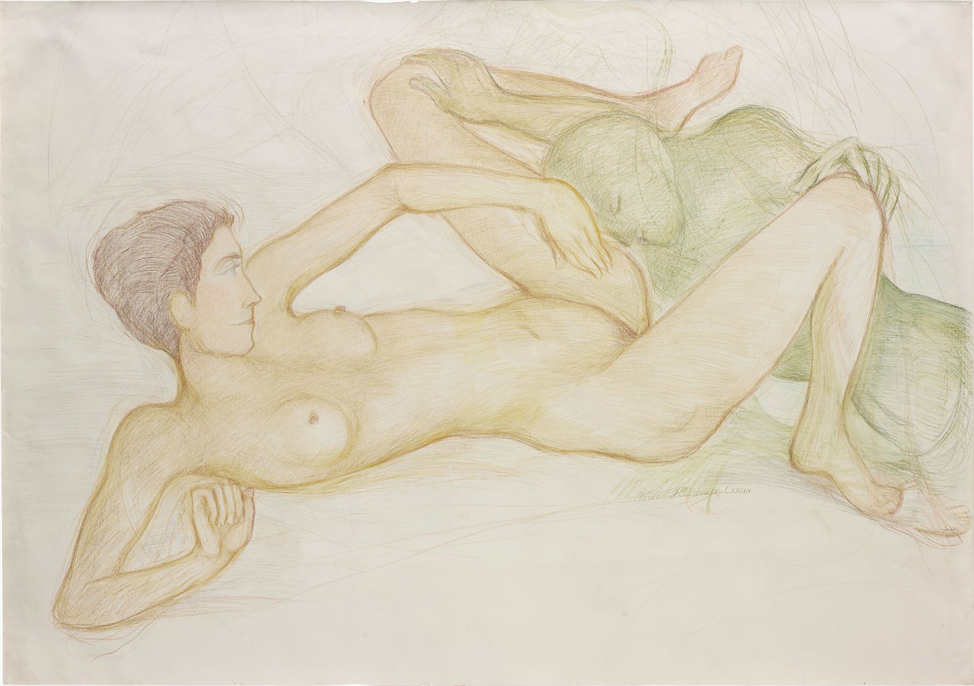 Pierre Klossowski (1905, 2001) was a French writer, philosopher, and visual artist whose large-scale pastel and pencil drawings explored themes of eroticism, transgression, theology, and the body, often depicting mythological or fantastical scenes with an unsettling, dreamlike intensity. A close associate of Georges Bataille, Michel Foucault, and Gilles Deleuze, Klossowski turned seriously to visual art later in life, producing highly distinctive figurative works that blurred boundaries between desire, sacred ecstasy, and perversion. His drawings, frequently featuring his muse and wife Denise (whom he called 'Roberte'), became celebrated in the contemporary art world for their unique intersection of literary and philosophical concerns with the visual.