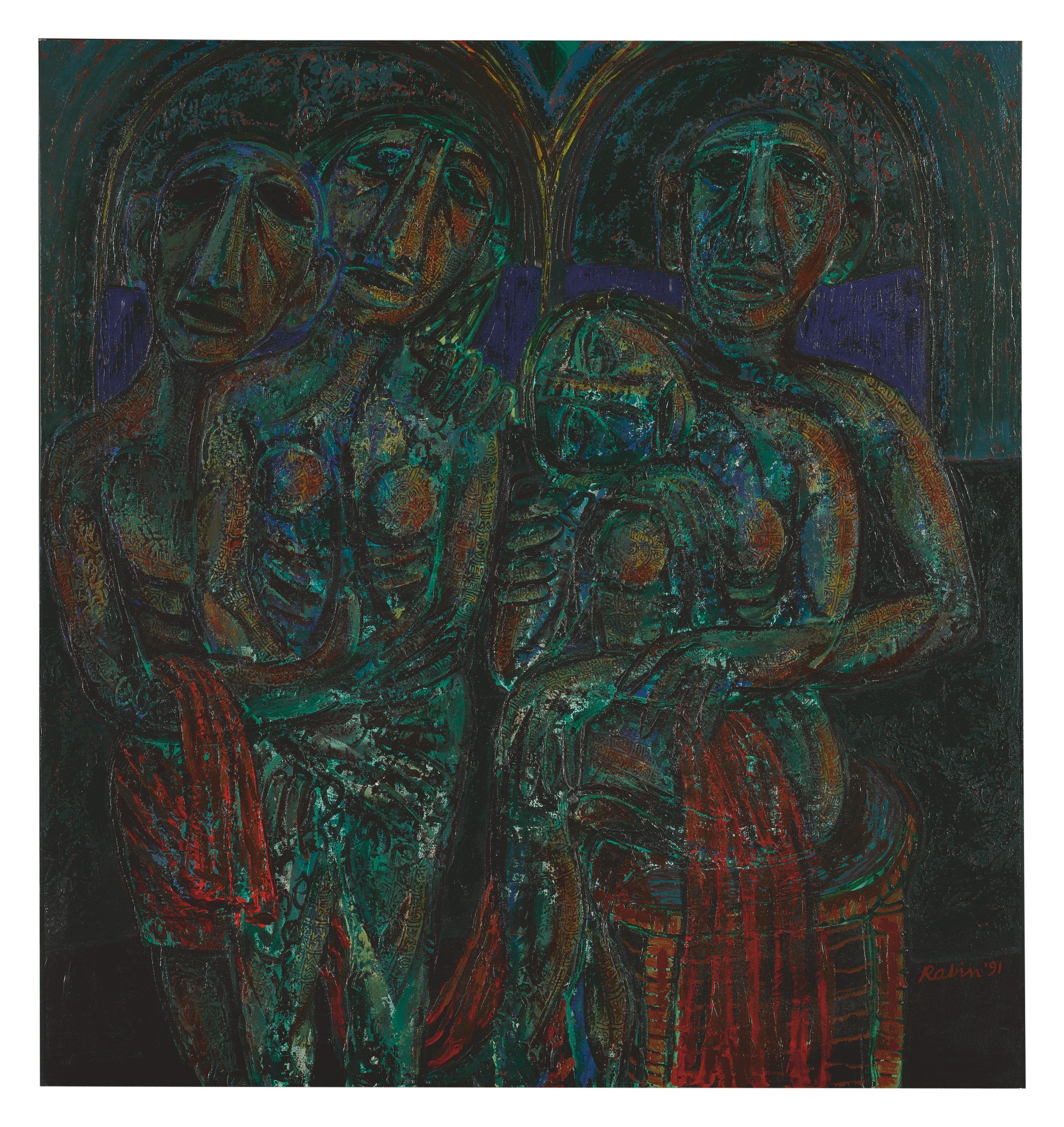 Rabin Mondal (1929, 2019) was a celebrated Indian painter known for his raw, expressionistic depictions of marginalized human figures, suffering, and the human condition. Largely self-taught and associated with the Calcutta art scene, he developed a distinctive style characterized by distorted forms, dark tones, and visceral emotional intensity. His works have been exhibited internationally and have achieved significant recognition at major Indian auction houses including Saffronart and Christie's.