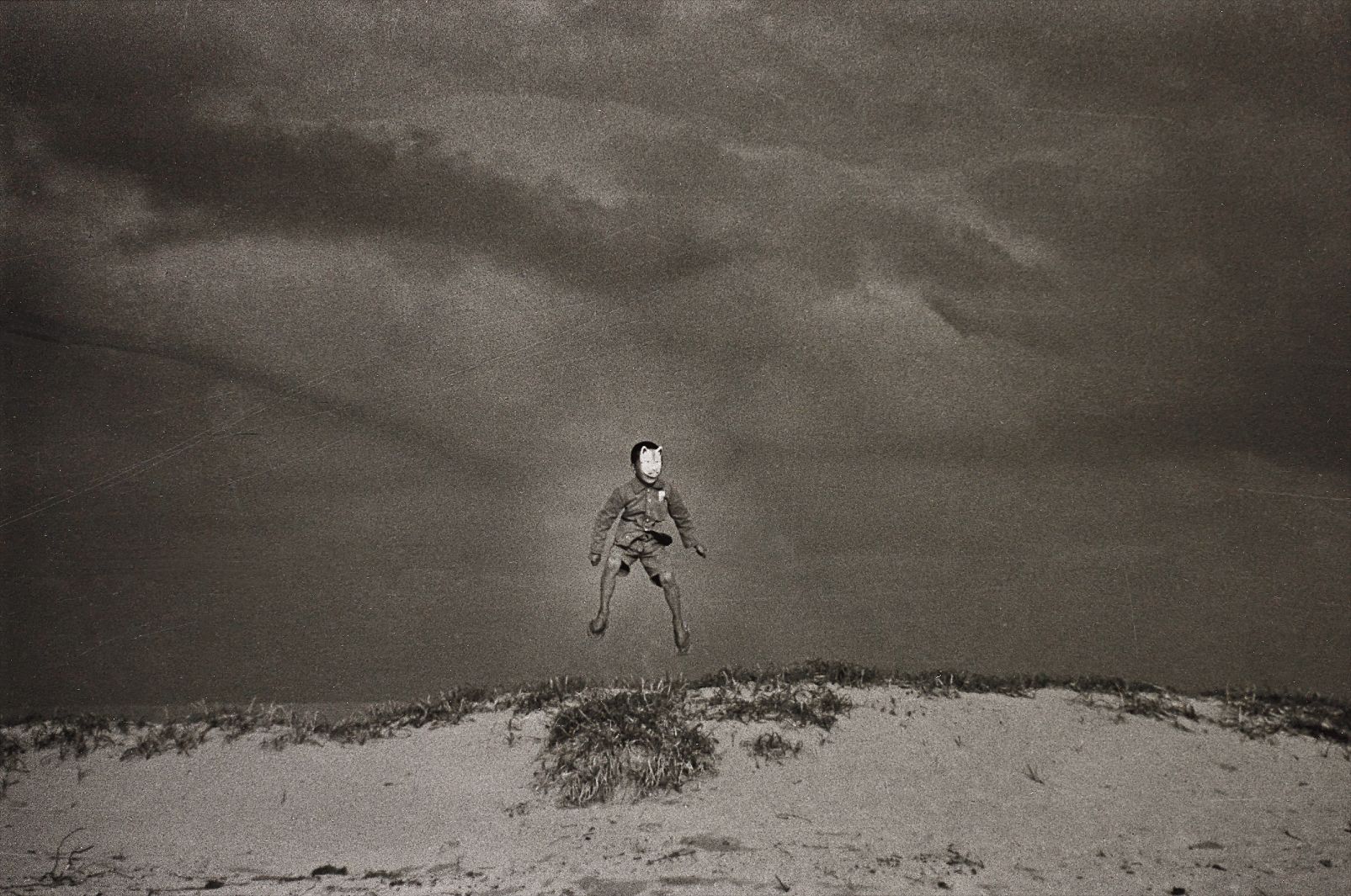 Shoji Ueda (1913, 2000) was a Japanese photographer renowned for his whimsical, surrealist-inflected black-and-white photographs taken in the vast sand dune landscapes of Tottori Prefecture, Japan. His work often features solitary or grouped figures arranged in dreamlike, theatrical compositions against stark, minimalist backdrops, blending humor with a quiet sense of the uncanny. Considered one of Japan's most important 20th-century photographers, Ueda's distinctive vision influenced generations of artists and earned him international recognition.
