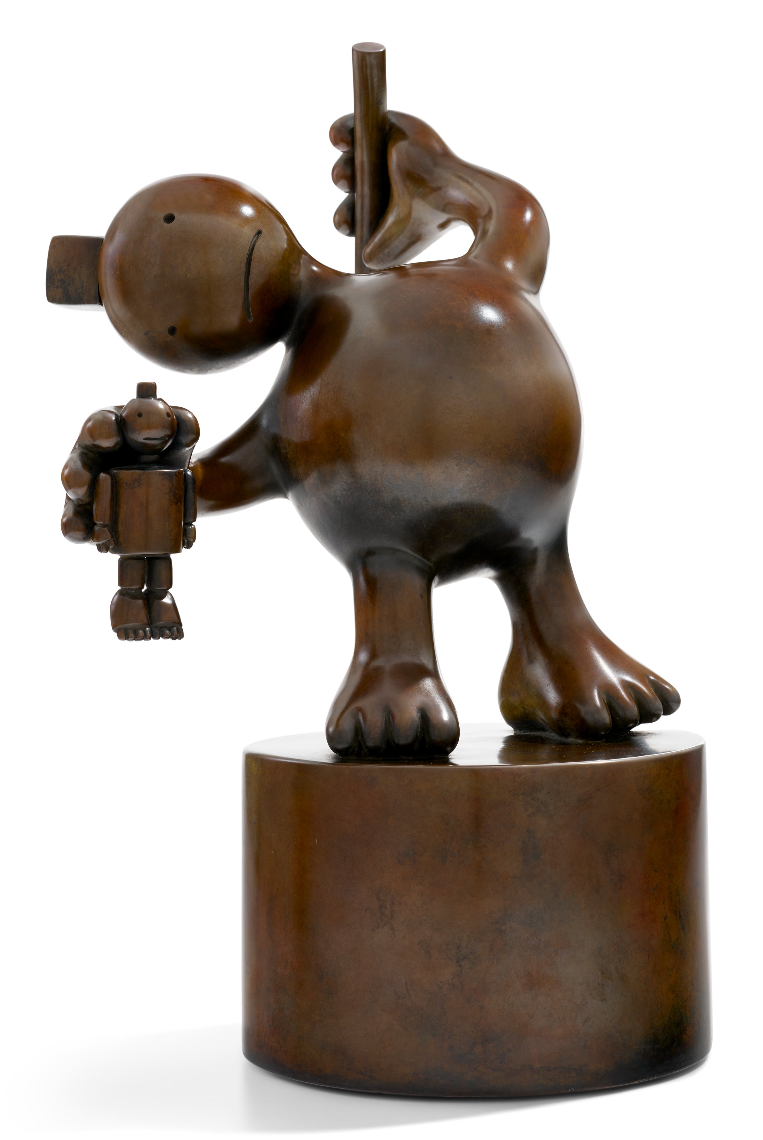 His Zodiac Love from 1982, executed in painted hydrocal, demonstrates this early fluency, combining mythological reference with an almost childlike directness that is entirely his own. The sculptures that emerged through the late 1980s and into the 1990s cemented his reputation. Nero's Apartment House from 1989, rendered in bronze, exemplifies his ability to layer historical and political allusion within forms that reward both casual and scholarly attention. The Crying Giant and Kindly Geppetto, both from the early 2000s, show the emotional range he commands: pathos and tenderness sit comfortably alongside satire and wit.