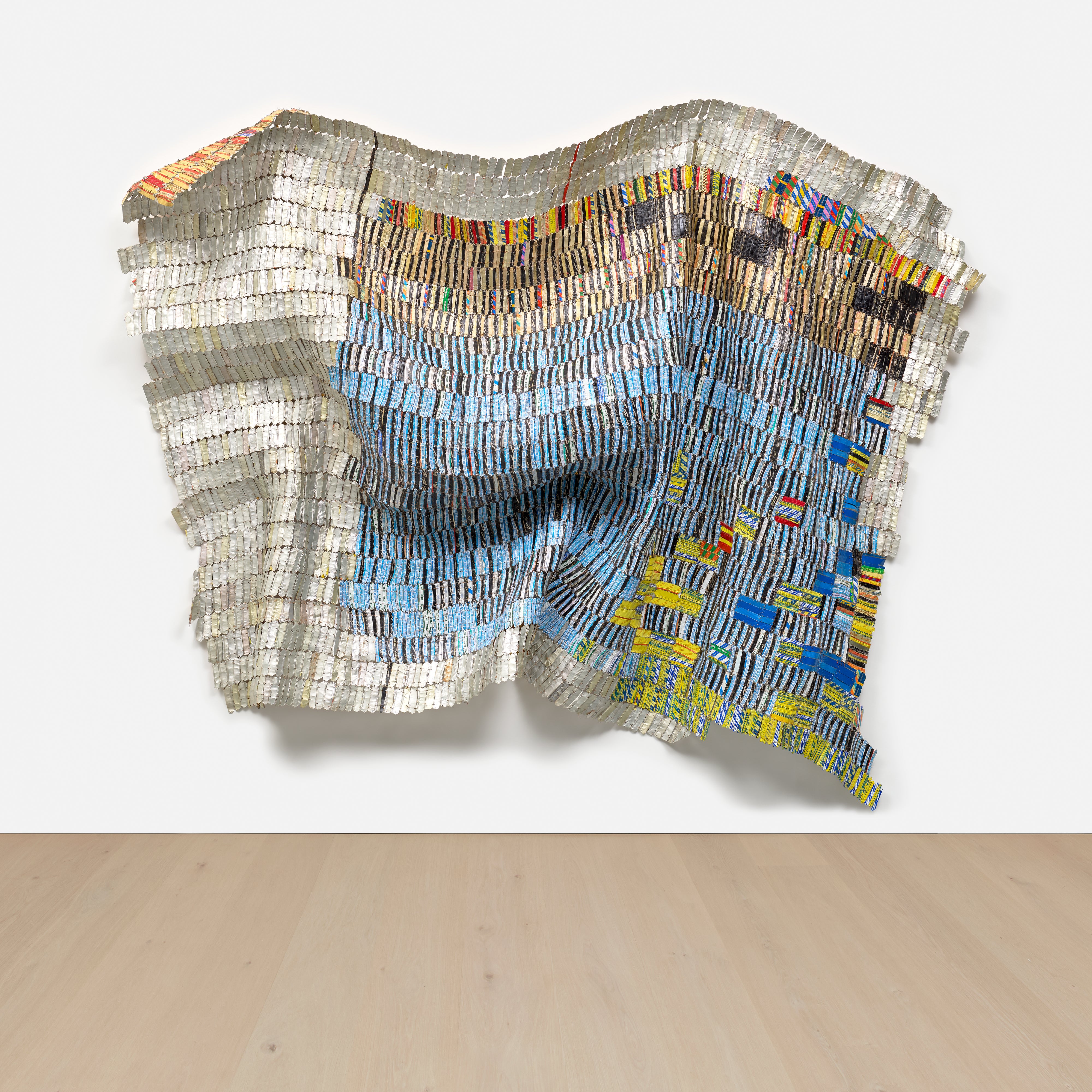 El Anatsui transforms discarded and commonplace materials such as bottle caps and aluminum scraps into monumental works of striking visual beauty, paralleling Muniz's practice of elevating waste and everyday substances into high art. Both artists use materiality itself as a conceptual engine to address themes of consumption, value, and transformation.
