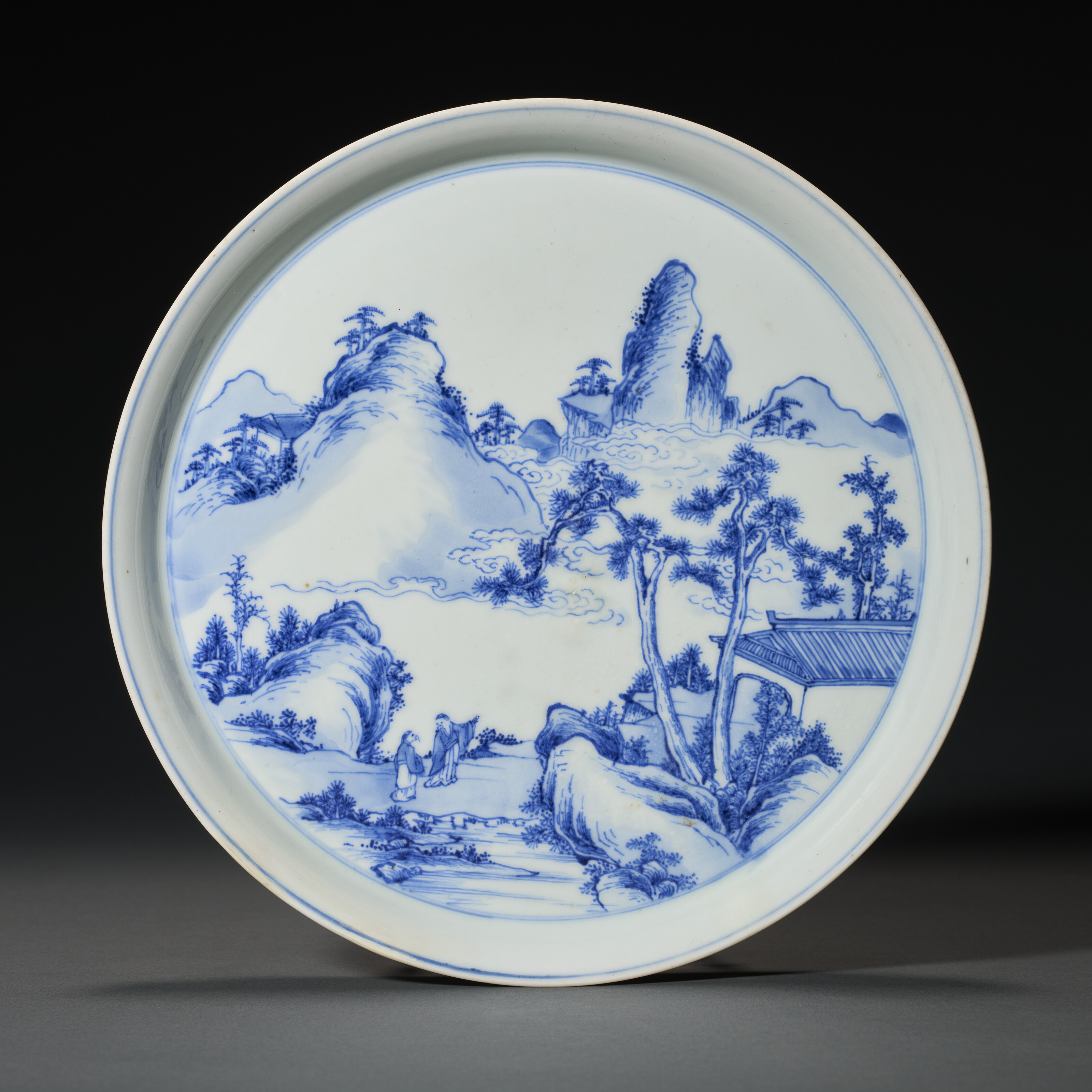 This blue and white porcelain dish from the Kangxi-Yongzheng period exemplifies the refined aesthetic of Qing Dynasty ceramic production, when Chinese potters achieved unparalleled technical mastery in underglaze cobalt decoration. The landscape composition, rendered in varying tones of blue on white ground, demonstrates the sophisticated pictorial traditions adapted from literati painting onto ceramic surfaces. Such dishes were highly valued both within the Chinese court and internationally, reflecting the period's reputation for producing some of the finest porcelain in history.