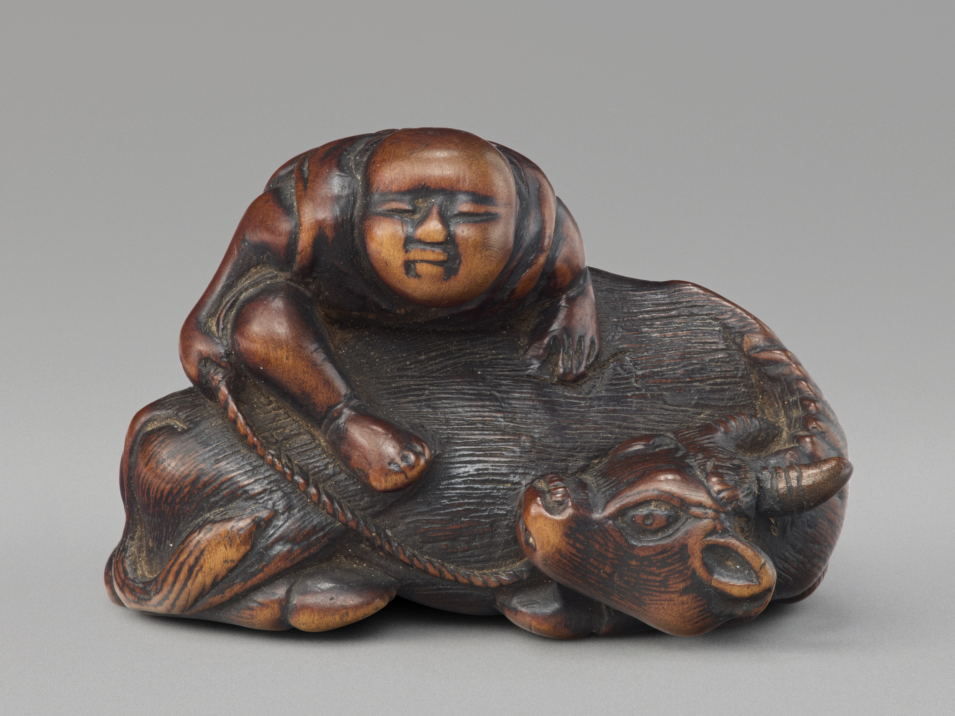 This 18th century netsuke carved by Tsuji exemplifies the Japanese miniature sculpture tradition, depicting a herd boy resting peacefully atop a buffalo in finely worked wood. The piece demonstrates the characteristic skill of Edo period artisans in capturing naturalistic detail and gentle movement within the small functional form designed to hang from a kimono sash. The subject matter, drawn from Chinese pastoral imagery, reflects the cultural refinement and artistic sophistication valued among educated Japanese collectors of the period.