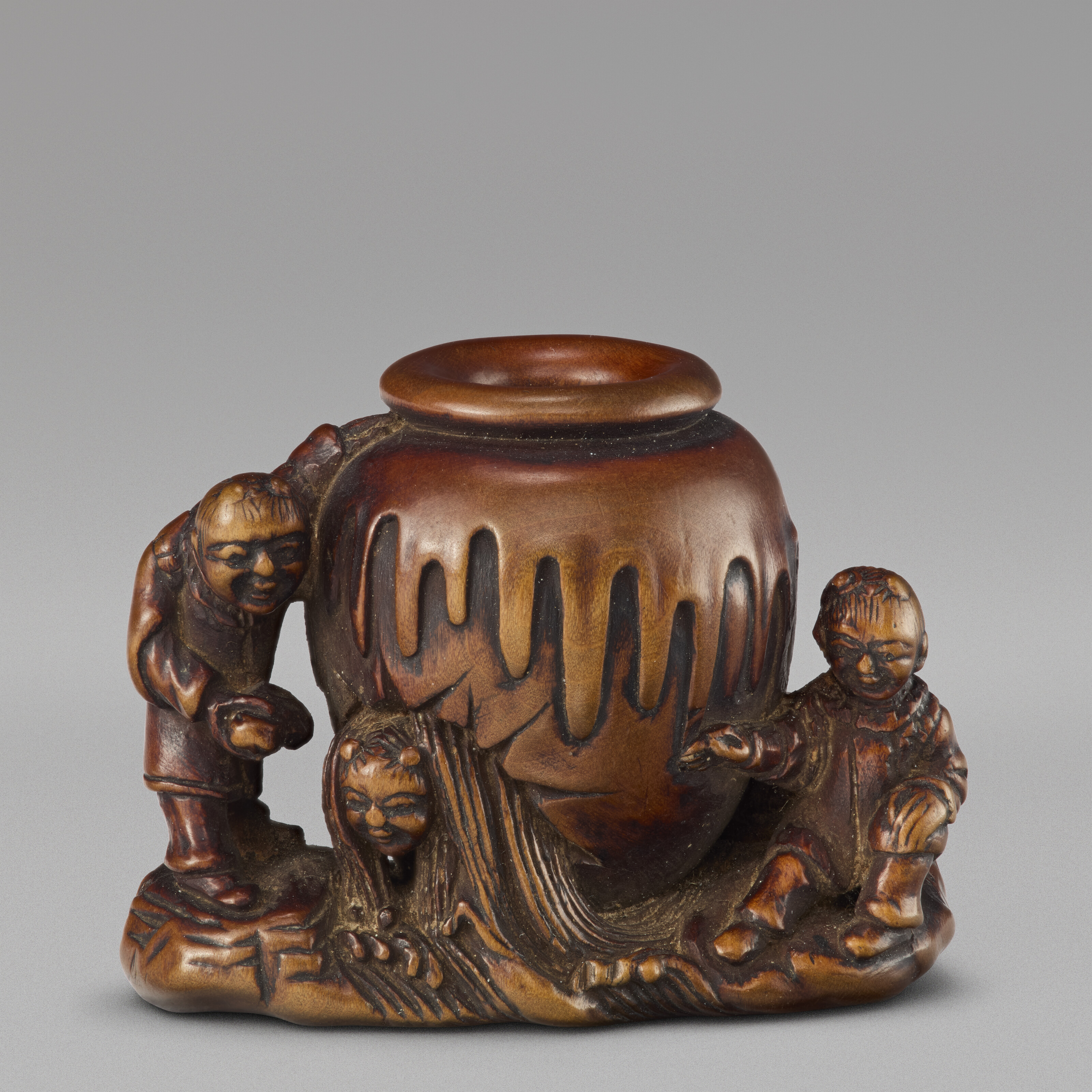 This carved wood netsuke depicts Kamewari Onko, a legendary figure from Japanese folklore, rendered in the miniature sculptural form that characterized these practical ornaments of the Edo period. Netsukes served as toggles to secure containers suspended from the sashes of kimono, yet artisans lavished remarkable detail and craftsmanship on these diminutive works, making them highly prized by collectors. The piece exemplifies the period's sophisticated woodcarving tradition, combining functional design with refined artistic expression in a form rarely exceeding a few centimeters in height.