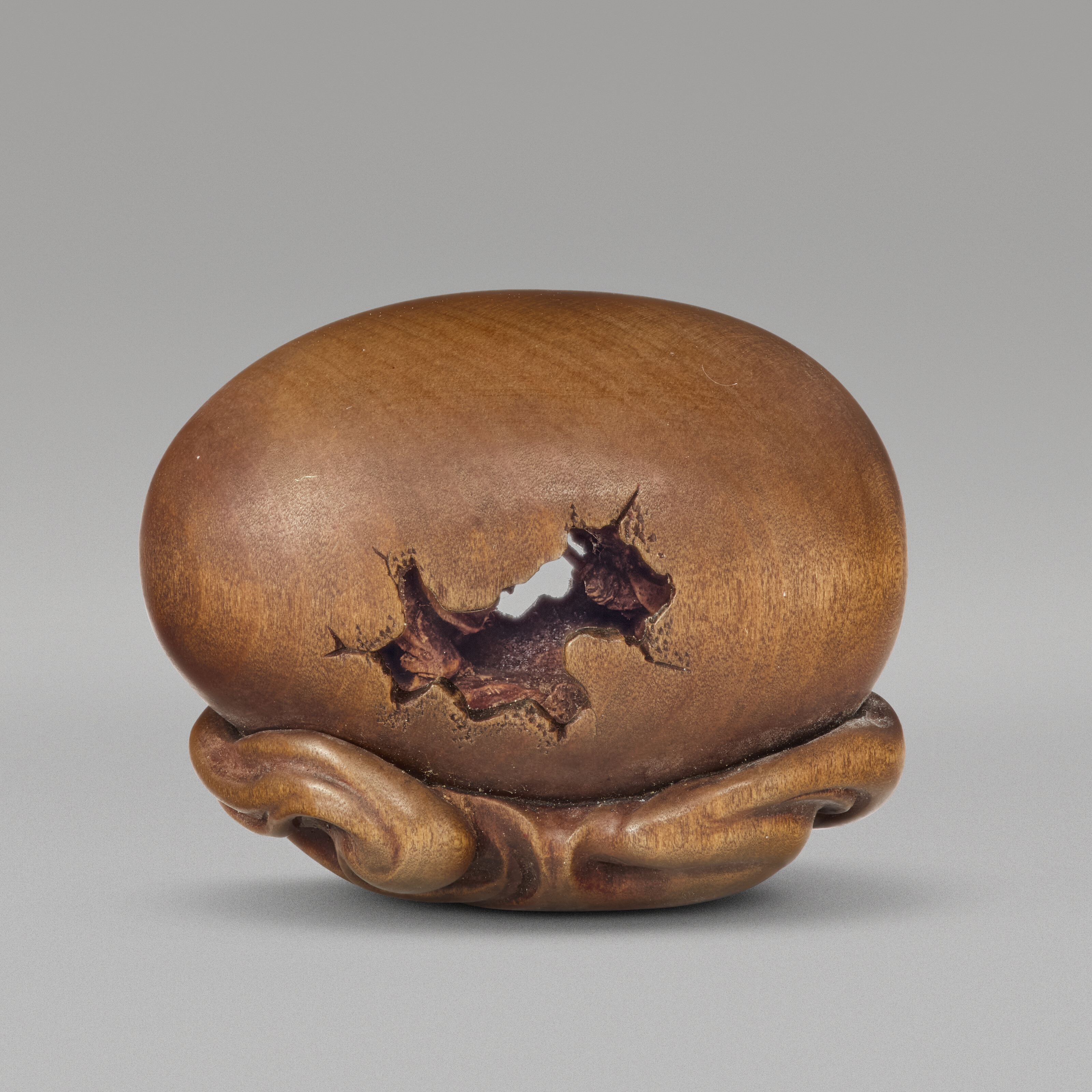A Carved Wood Netsuke Miniature Sculpture Of Kurama Tengu And Usihwakamaru In An Egg