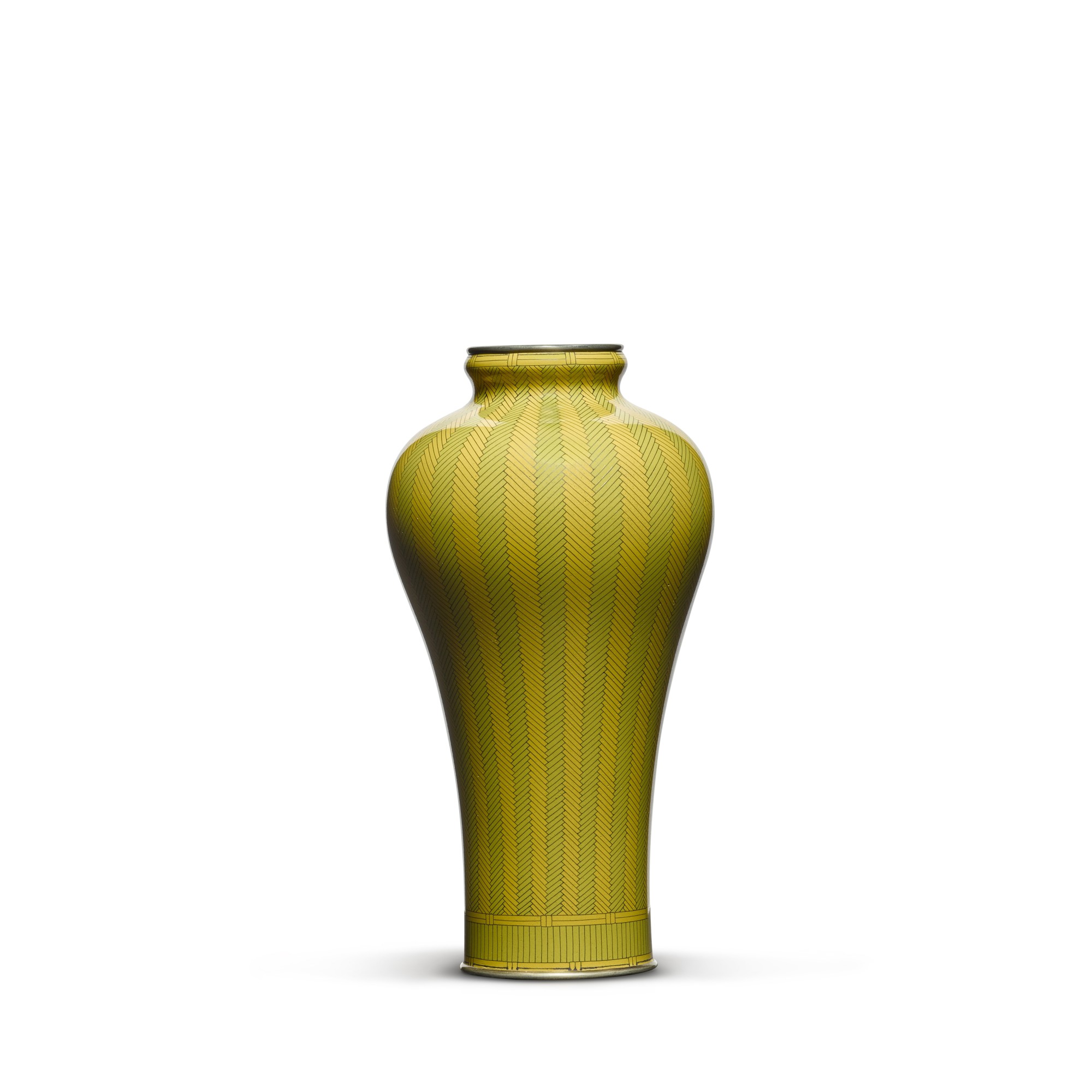 - the meiping form vase decorated overall in shades of green cloisonné enamel worked in silver work, intricately delineated with a split woven bamboo design