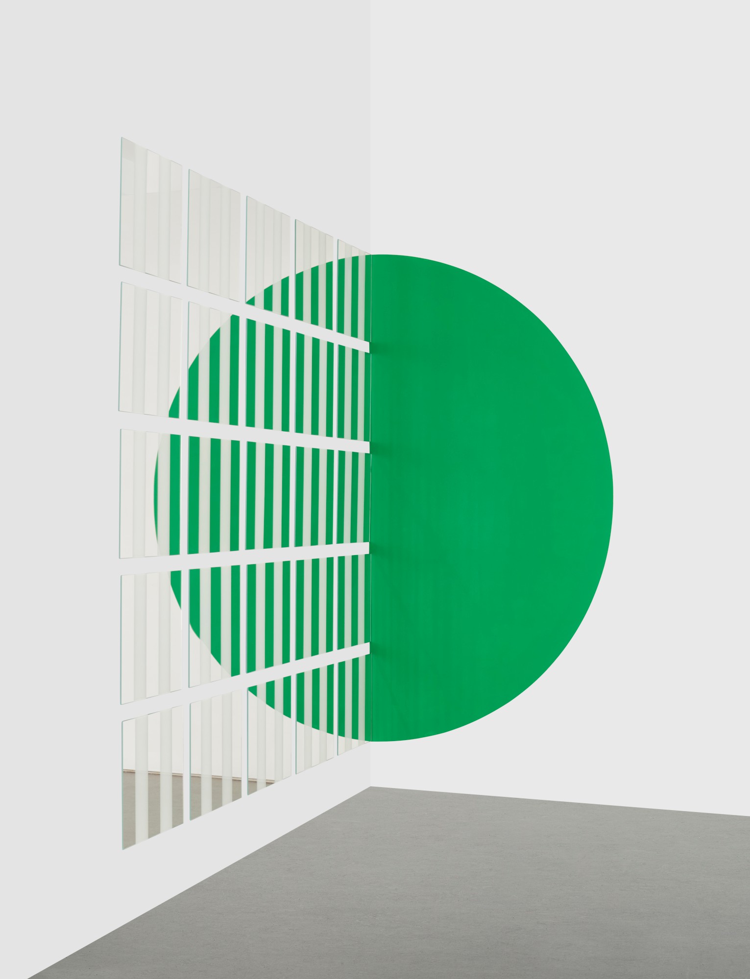 '1/2 Cercle doublé mais rayé - Vert' from the Mallin Collection is a 2016 work combining acrylic, mirror, and Plexiglas to create an interactive optical experience. The geometric composition plays with reflection and perception through the use of mirrored surfaces. The work demonstrates contemporary approaches to abstraction that emphasize viewer participation and visual illusion.
