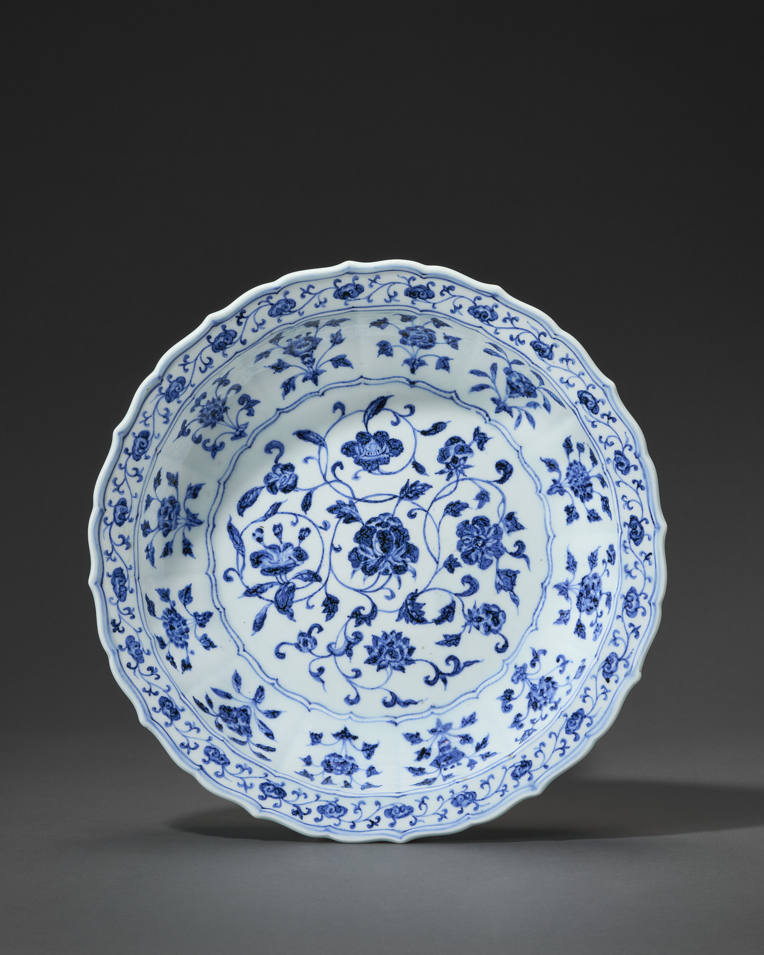 LITERATURE Philadelphia Museum of Art, Exhibition of Ming Blue and White, Philadelphia, 1949, p. 40, no. 40. Bruce Museum, Flora and Fauna: Themes and Symbols in the Decorative Arts of China, Greenwich, Connecticut (brochure). EXHIBITED Philadelphia, Philadelphia Museum of Art, Exhibition of Ming Blue and White, 19 October-4 December 1949; also shown at the Art Institute of Chicago. San Antonio, San Antonio Museum of Art, Underglaze Decorated Chinese Porcelain 14th-18th Century, 1958. Greenwich, Connecticut, Bruce Museum, Flora and Fauna: Themes and Symbols in the Decorative Arts of China, 23 June-9 September 2007. Conditions of sale Brought to you by Rufus Chen (陳嘉安) Head of Sale, AVP, Specialist Check the condition report or get in touch for additional information about this ASIANARTNY@CHRISTIES.COM +1 212 636 2180 VIEW CONDITION REPORT LOT ESSAY This superb dish exemplifies a distinguished category of Ming dynasty blue-and-white porcelains that was held in exceptional esteem by the imperial courts of Asia during the 15th to 17th centuries. It was produced at the imperial kilns for the Yongle Emperor (1403–25), whose reign is celebrated for the extraordinary refinement of the artworks made for his palace and particularly, for dishes of this type. Archaeological excavations at Jingdezhen—the site of the imperial kilns—have uncovered a number of dishes of related form and scale, decorated either in underglaze cobalt blue or in gilt. Blue-and-white porcelains of this type were also deeply admired by the Ottoman sultans. This is clearly reflected in the renowned holdings of the Topkapi Saray Museum in Istanbul, which include numerous early 15th-century examples of similar proportions and design variations; see J. Ayers and R. Krahl, Chinese Ceramics in the Topkapi Saray Museum, vol. II, 1986, pp. 512–4, nos. 601, 602, and 605. In Safavid Iran, early 15th‑century Chinese porcelain dishes of this form were highly valued. The Safavid dynasty, ruling from 1501 to 1736 and originating from Iranian Kurdistan before settling in Ardabil, is particularly associated with the famous Ardabil Shrine complex. Under Shah ‘Abbas I (r. 1571–1629), the shrine was endowed with more than a thousand pieces of Chinese porcelain. By the summer of 1611 these works were installed in the shrine’s “China Chamber.” The enduring Safavid admiration for dishes of this very pattern is demonstrated by the eleven surviving examples still preserved at Ardabil; three are illustrated in J.A. Pope’s Chinese Porcelains from the Ardebil Shrine, London, 1981, pl. 35, nos. 29.101–111. Dishes of this bracket‑lobed form appear with a range of decorative schemes. The rims may be decorated with wave designs, floral scroll, or—as seen on the present dish—the auspicious lingzhi scroll. The cavetto typically features naturalistic floral sprigs, though a stylized variant with stems curling around the blossoms is also known. This latter style, combined with a wave border, can be seen on a dish in the Percival David Collection (Blue and White for China, 2004, pp. 22–3, no. 3). Central panels vary as well, featuring grape clusters (e.g., the British Museum dish illustrated in J. Harrison‑Hall, Ming Ceramics in the British Museum, 2001, p. 117, no. 3:36), a hexafoil floral scroll (see the excavated dish published by the Chang Foundation, pp. 165–5, no. 50), or, as on the present dish, a foliate medallion of four blooms encircling a central flower. Beyond the examples in the National Palace Museum and at Ardabil, dishes with identical decoration to the current dish can be found in the Museum of Far Eastern Antiquities, Stockholm, published by J. Wirgin, Ming Porcelain in the Collection of the Museum of Far Eastern Antiquities: Hongwu to Chenghua, Stockholm, 1991, cat. no. 13; the Museum of Decorative Arts, Copenhagen, published by A. Leth, Kinesisk Kunst i Kunstindustri Museet: Catalogue of Selected objects of Chinese Art in the Museum of Decorative Art, Copenhagen, Copenhagen, 1959, cat. no. 108; and the Meiyintang collection, published by R. Krahl, Chinese Ceramics from the Meiyintang Collection, vols. 1-2, London, 1994, cat. no. 662; while another from the collection of Professor E.T. Hall was published by Eskenazi in the catalogue Yuan and Early Ming Blue and White Porcelain, London, 1994, p. 36, cat. no. 11. READ MORE