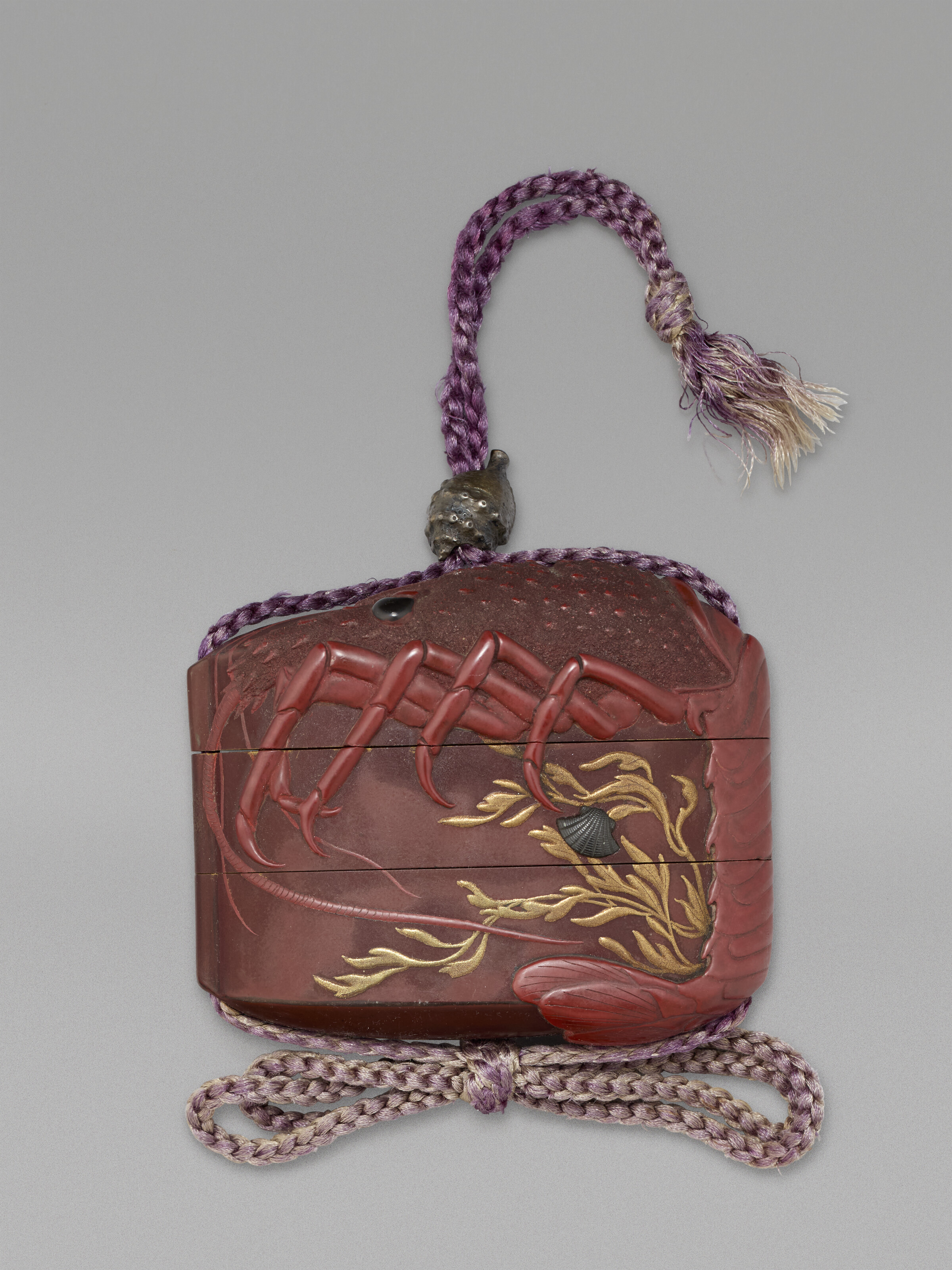 This two case inro from the 19th century Edo period, signed by Kanshosai, exemplifies the refined decorative arts of Japanese lacquerware during Japan's final feudal era. The piece features meticulously rendered prawn and shellfish motifs, likely executed in gold and colored lacquer techniques typical of inro design, which were functional containers worn suspended from the obi of the kimono. Such objects demonstrate the period's sophisticated integration of practicality and artistic excellence, with their small scale belying extraordinary technical skill and aesthetic refinement.