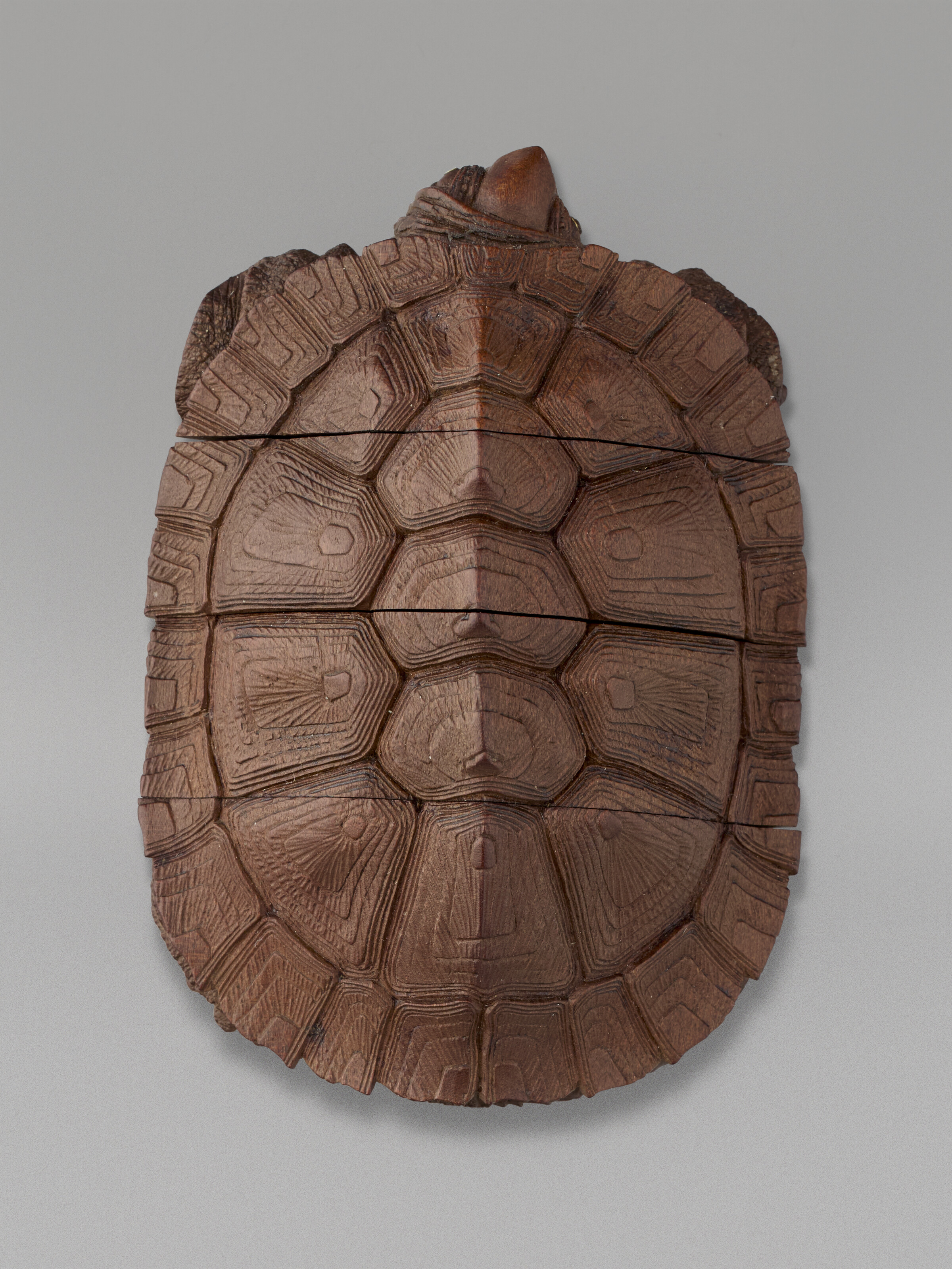 This three-case inro from the Edo period represents a refined example of Japanese decorative arts craftsmanship, featuring an ingenious tortoise form that serves both aesthetic and functional purposes. Signed by Shoto, the artist demonstrates mastery of wood inlay and carving techniques, with the tortoise shape allowing for a segmented container ideal for storing small precious items such as medicines or seals. The work exemplifies the period's sophisticated approach to functional luxury objects, blending zoomorphic design with practical utility in a format beloved by educated merchants and samurai during Japan's Tokugawa era.