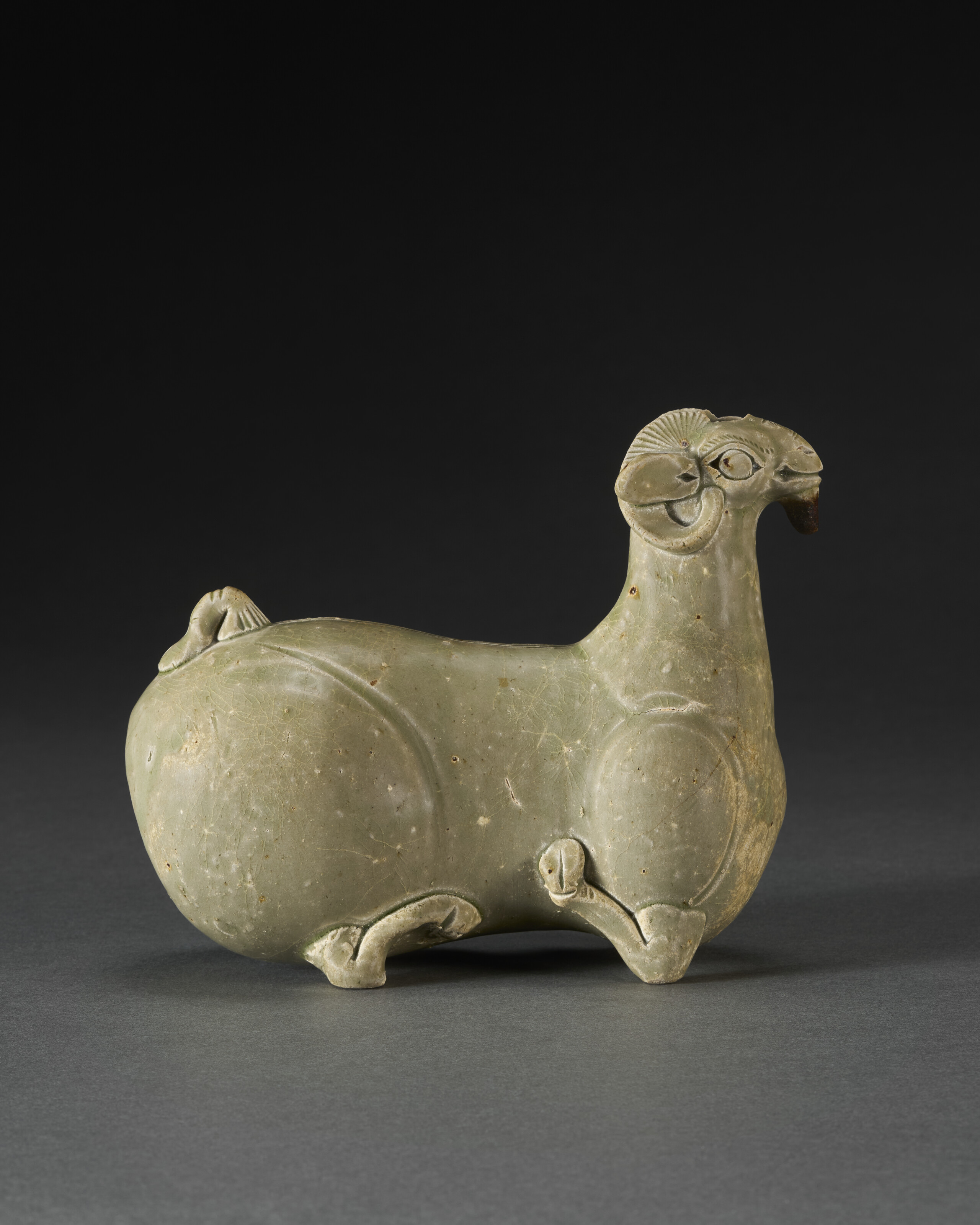 This Western Jin celadon vessel, crafted during China's early medieval period, ingeniously combines functional form with sculptural naturalism by fashioning the body as a recumbent ram. The piece exemplifies the technical sophistication of Jin-era potters, who achieved the characteristic pale jade green glaze through careful kiln management and feldspatc composition. The work demonstrates the cultural values of the period, merging practical tableware with zoomorphic imagery that likely carried auspicious or decorative significance in elite households.