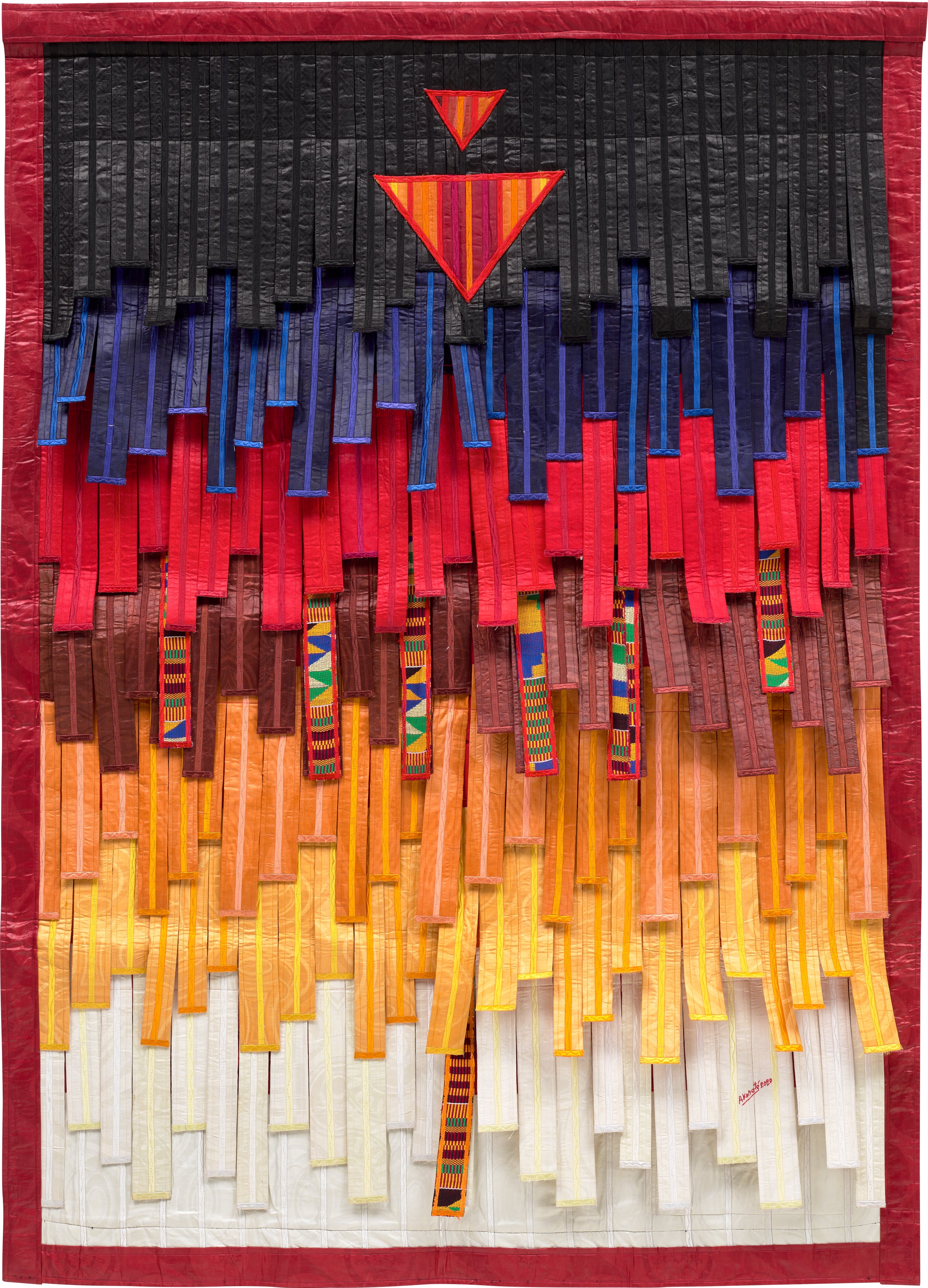 Abdoulaye Konaté's *Ocre et bleu au Kente (2 triangles)* (2020) is a striking textile composition that showcases the Mali-born artist's masterful use of traditional West African woven fabrics. The work features bold geometric triangular forms rendered in rich ochre and deep blue tones, drawing on the visual language of Kente cloth traditions while conveying themes of cultural identity and harmony. Konaté's signature approach transforms fabric into a powerful medium for social and political dialogue, elevating craft to the realm of contemporary fine art.