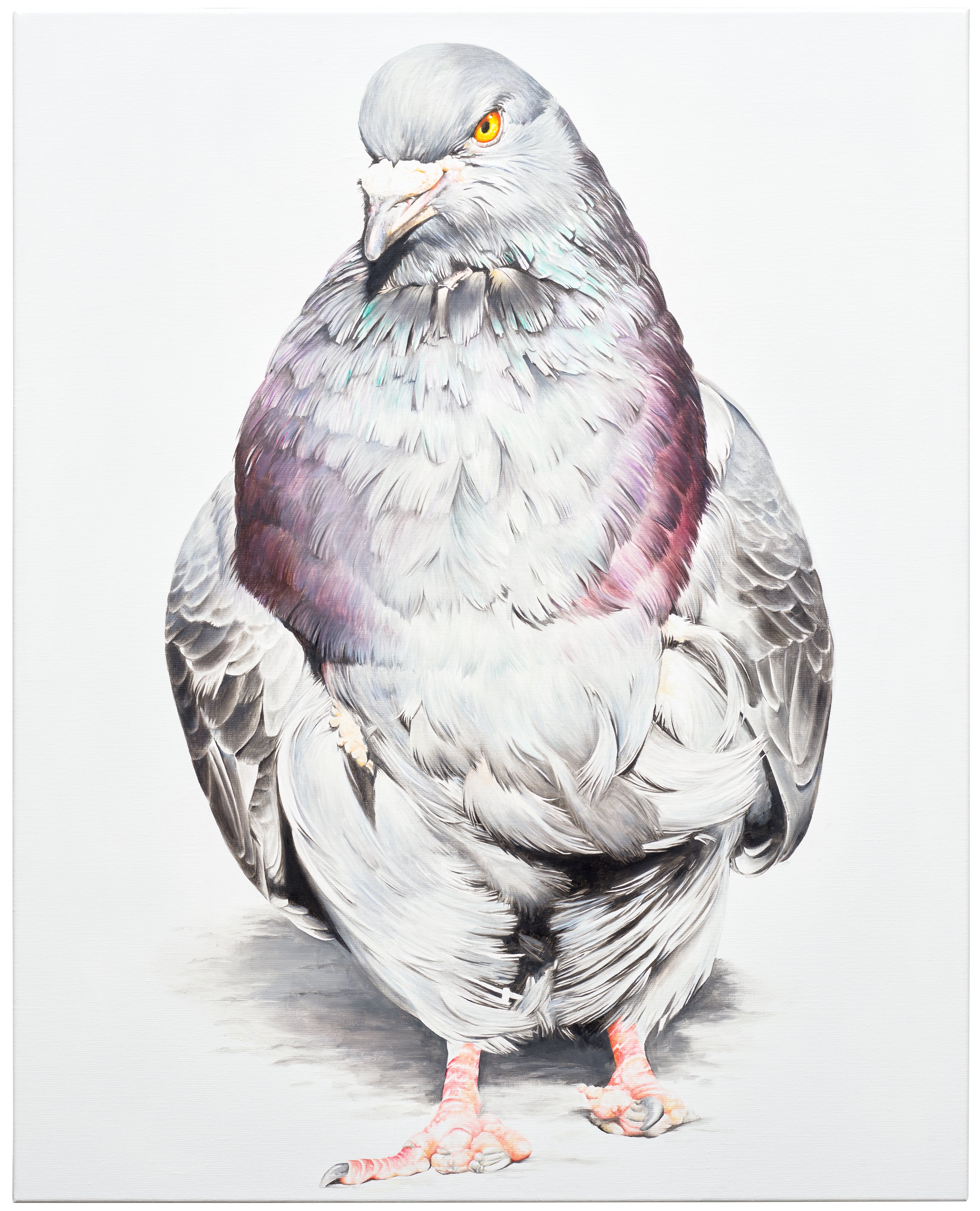 A hyper-realistic oil painting on linen depicting a close-up portrait of a pigeon, rendered with extraordinary detail and a sense of quiet dignity. Adele Renault elevates the overlooked urban bird through her meticulous brushwork, capturing the subtle iridescence of its feathers and the alert intelligence in its eye. The work challenges perceptions of beauty and worthiness, transforming a creature often dismissed as a pest into a compelling and monumental subject.