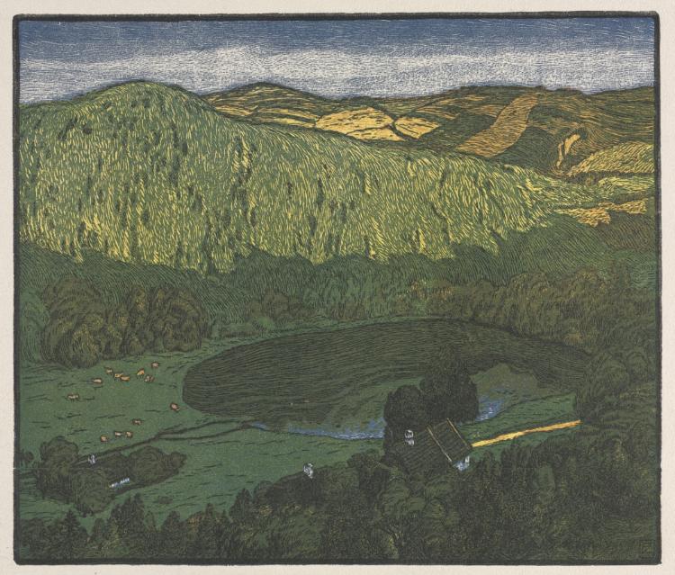 Color woodcut techniques bring vibrant life to this seascape, demonstrating the continued vitality of traditional printmaking methods in the early 20th century.