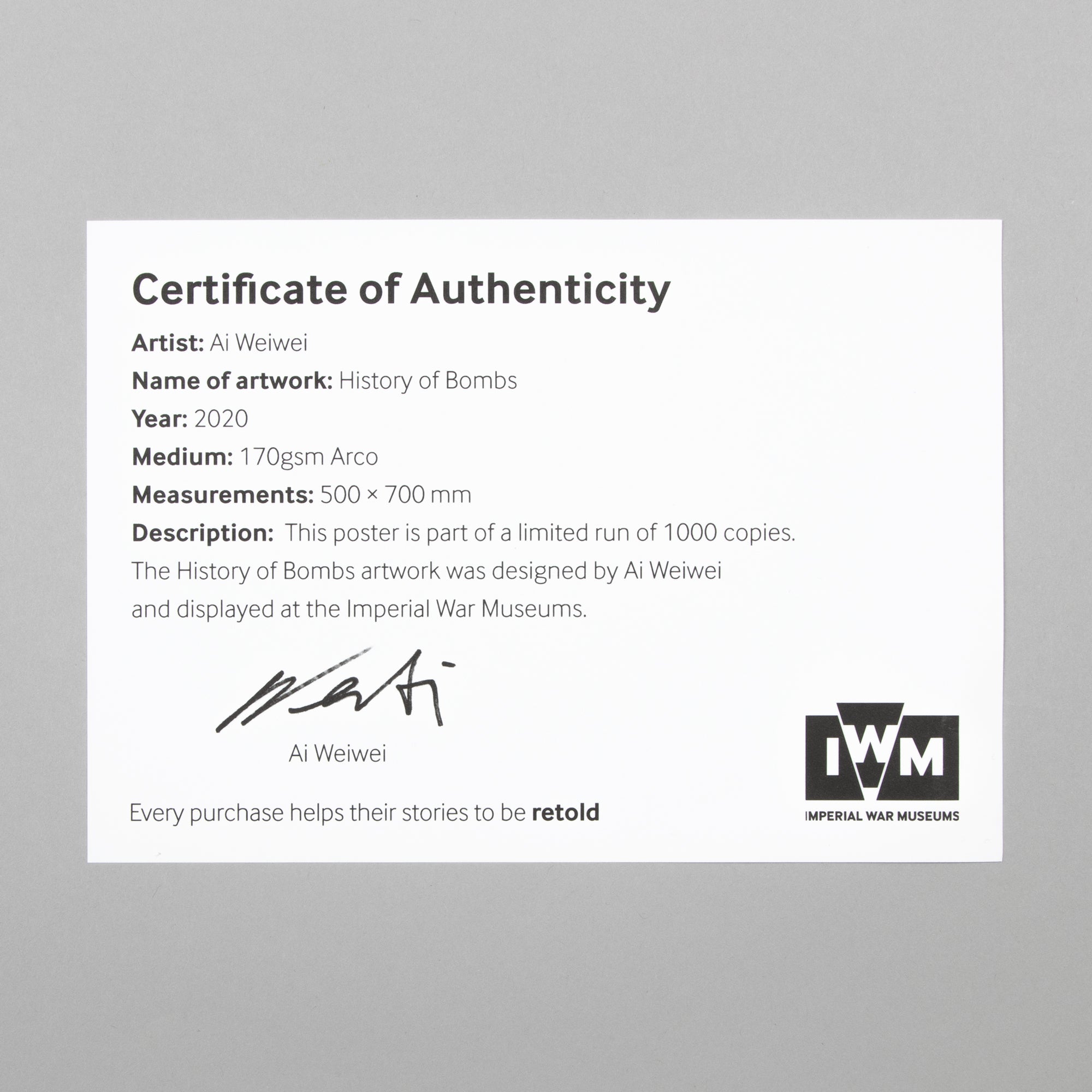 Ai Weiwei (Chinese, b. 1957) History of Bombs , 2020 Medium: Offset lithograph on paper Dimensions: 49.8 × 69.8 cm (19 3/5 × 27 1/2 in) Edition of 1000: Printed signature on accompanying certificate of authenticity Condition: Excellent