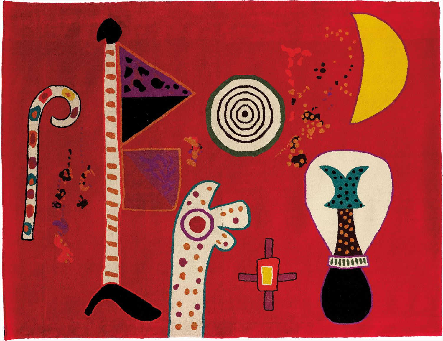 A wool pile tapestry by Alan Davie titled Flag Walk, rendered in various colors to create a dynamic textile composition.