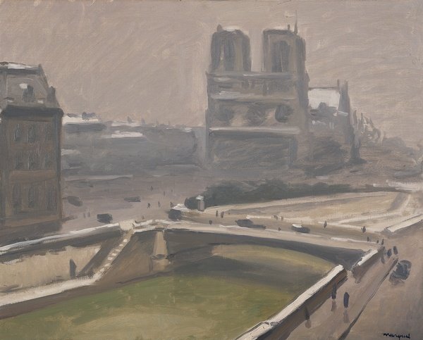 Snow transforms the Gothic cathedral into a study of tonal values, showcasing Marquet's ability to find poetry in familiar Parisian landmarks through atmospheric effects.
