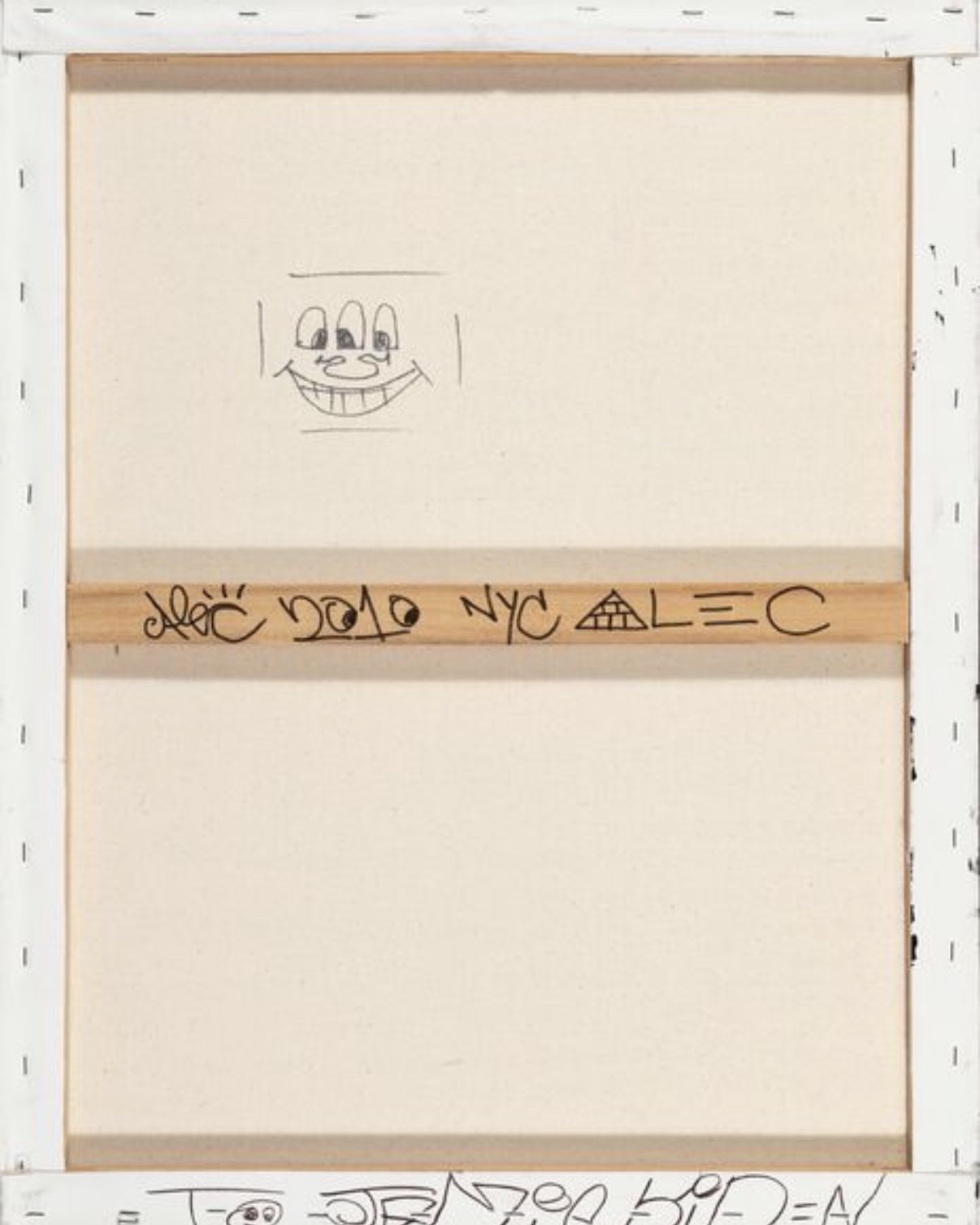 This energetic mixed-media work features Alec Monopoly's signature character, the Monopoly Man, reimagined as a DJ spinning records with graffiti-style text including "WALL" and "ALEC". Created on a collaged musical sheet background, the composition showcases Monopoly's distinctive street art aesthetic with bold black brushwork and a striking red tie accent. The piece is signed, dated, and inscribed on the reverse by the artist.