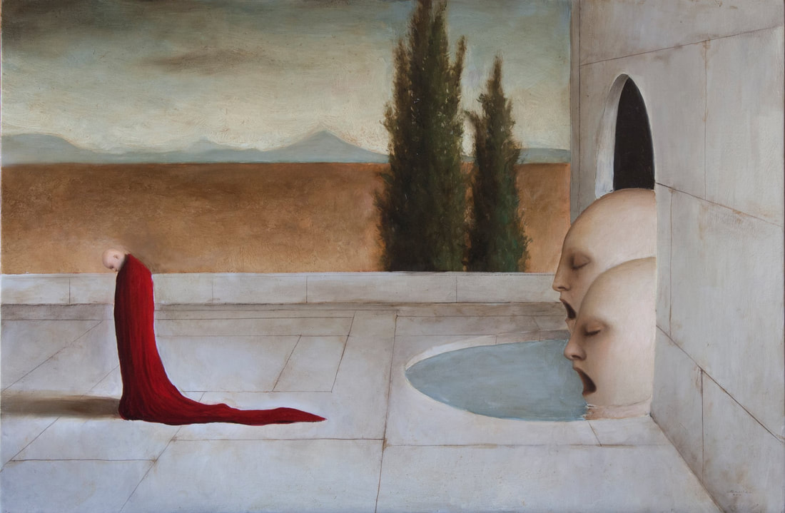 This haunting surrealist work depicts two bald, mask-like faces emerging from white stone architecture, with one appearing to submerge into a circular pool. A crimson-cloaked figure reclines in the foreground against a Tuscan landscape featuring cypress trees and distant mountains. The painting combines classical Renaissance composition with dreamlike, enigmatic imagery characteristic of metaphysical art.