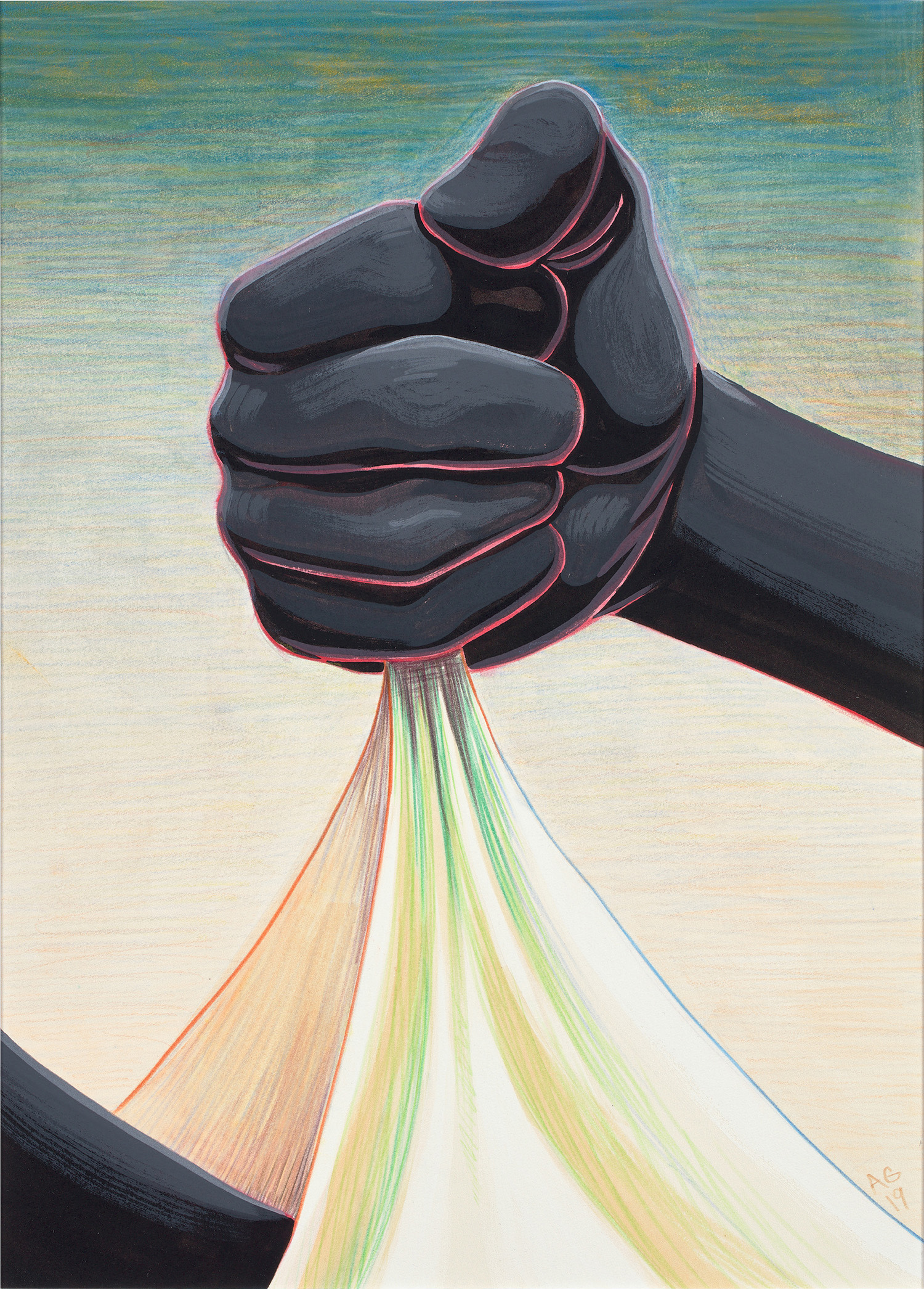 Alex Gardner's Hanger, created in 2019, combines gouache, colored pencil, and oil pastel on paper to create a mixed-media composition. The layering of these materials produces a complex visual experience and textured surface.