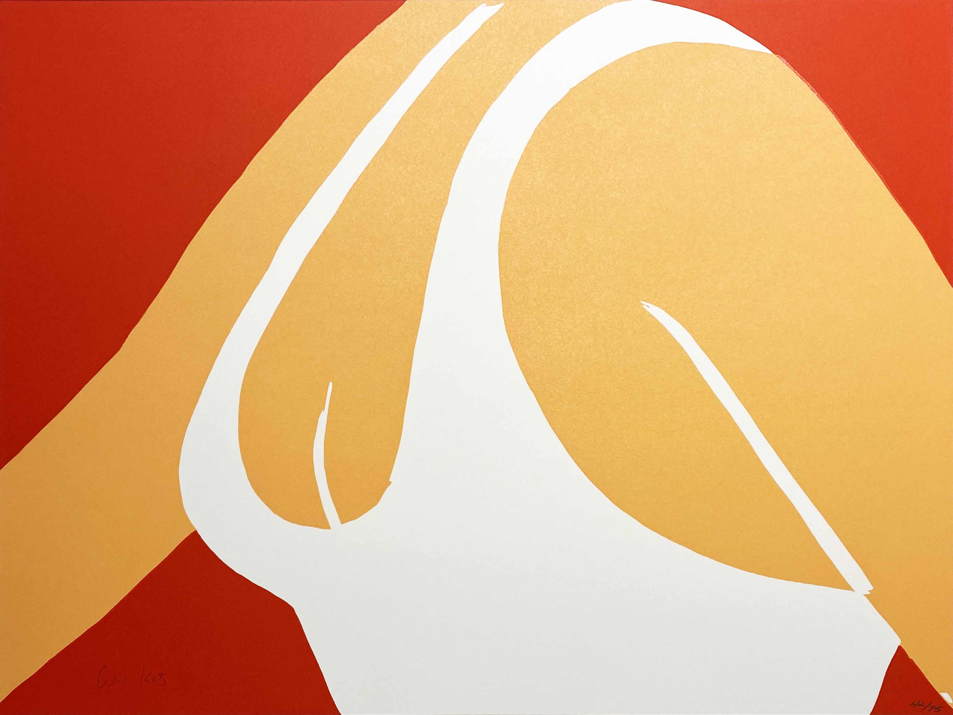 This vibrant woodcut exemplifies Katz's signature style of bold, simplified forms and saturated color, applying his iconic approach to portraiture within the commercial imagery of mid-century American advertising. The work demonstrates his masterful translation of his painting technique to printmaking, maintaining the crisp edges and flat color planes that define his aesthetic.