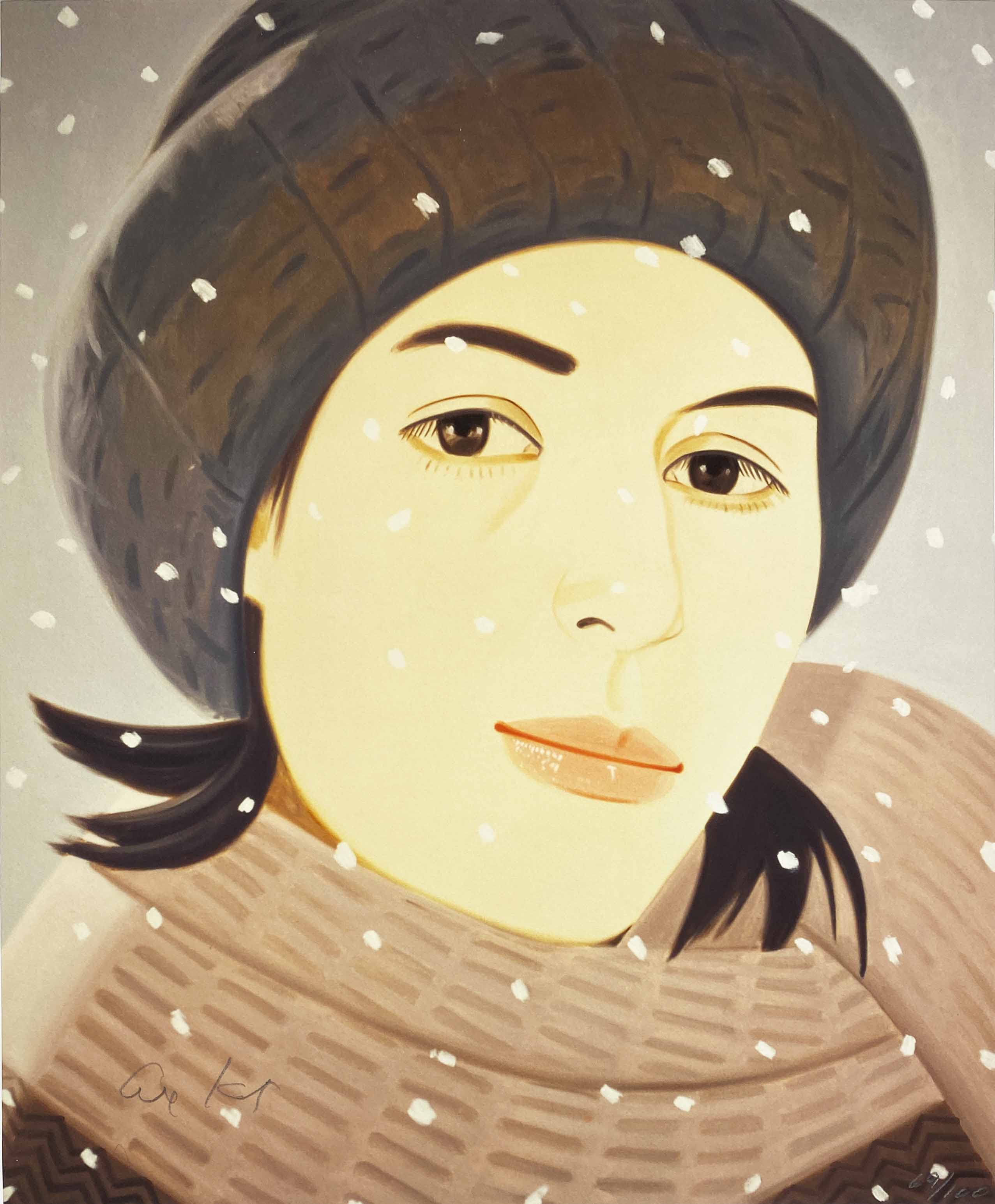 This intimate portrait exemplifies Katz's signature reductive style, capturing his frequent muse Ada through bold, simplified forms and a restrained winter palette. The high-quality archival pigment printing process faithfully reproduces Katz's characteristic flat planes of color and sharp contours that have defined his portraiture for over six decades.