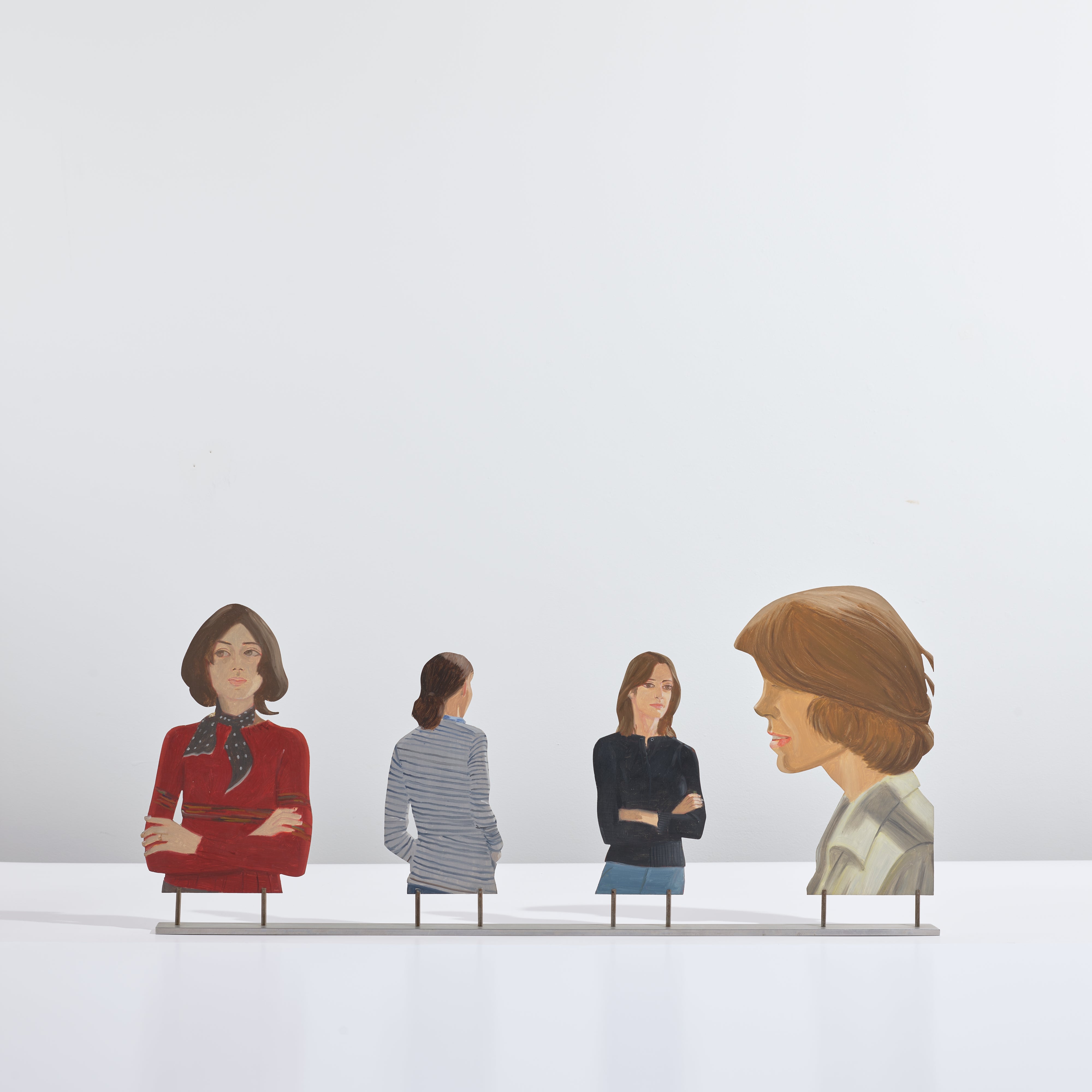"Four Figures" by Alex Katz is an oil painting on shaped aluminum that presents the artist's characteristic style of bold, flattened forms and simplified human figures. The double sided format of the work allows viewers to encounter different compositions or perspectives depending on which side they view, creating an innovative spatial and perceptual experience. Katz's choice of aluminum as a support, rather than traditional canvas, emphasizes the modernist materiality of the work while the vivid color palette and gestural brushwork remain central to his aesthetic approach.