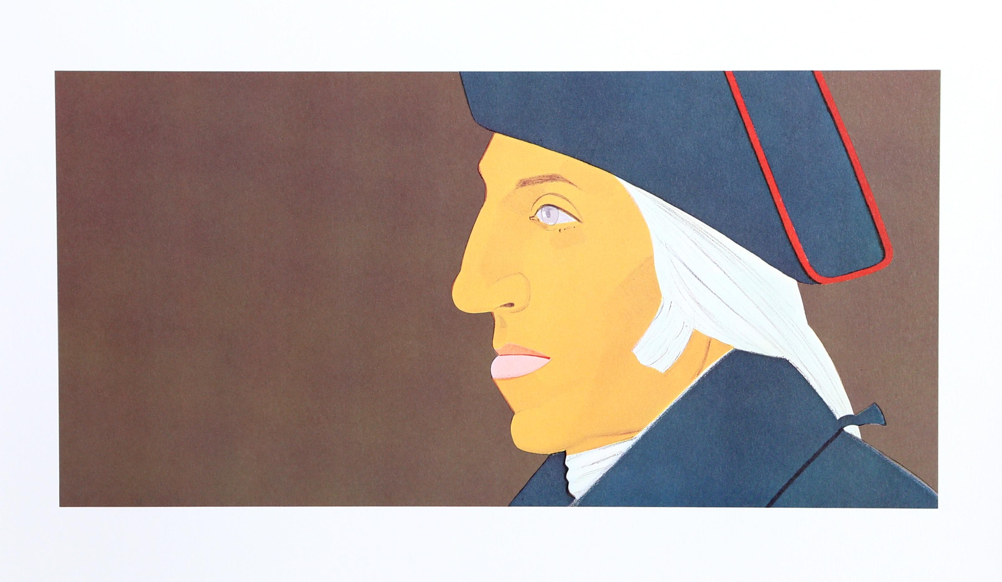 Alex Katz's "George Washington" is an offset lithograph that presents the founding father in the artist's characteristically bold and simplified style. The work exemplifies Katz's approach to portraiture, which prioritizes flattened forms, limited color palettes, and a modern graphic sensibility rather than historical accuracy or elaborate detail. As with much of Katz's output, the print demonstrates his ability to distill a subject into its essential visual components while maintaining a distinctive contemporary aesthetic.