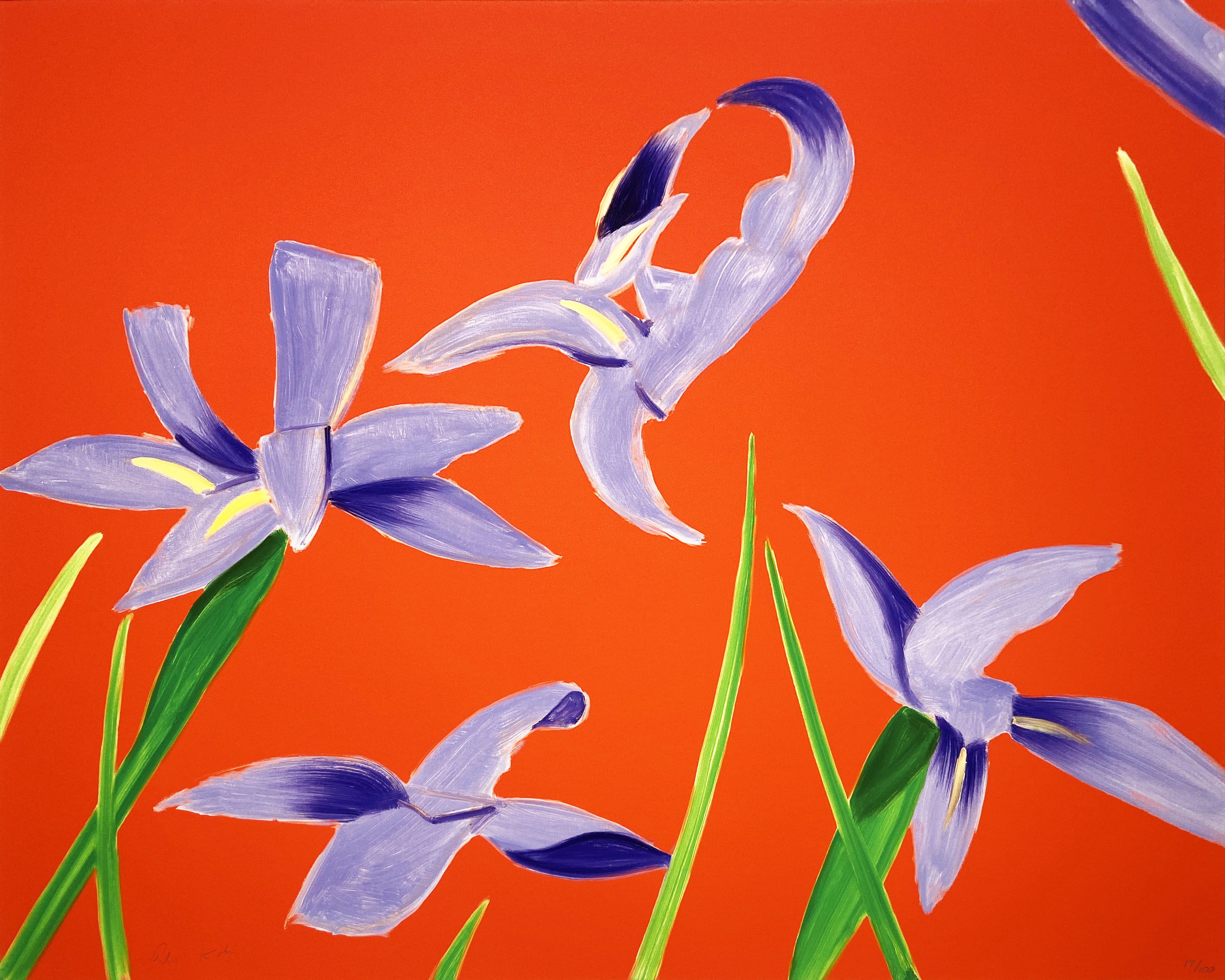In this 2023 archival pigment print, Katz applies his signature flat, simplified aesthetic to botanical subject matter, rendering purple irises against a bold red ground with characteristic color saturation and graphic clarity. The work exemplifies the artist's continued exploration of nature themes through his distinctive reductive approach to form and vibrant palette.