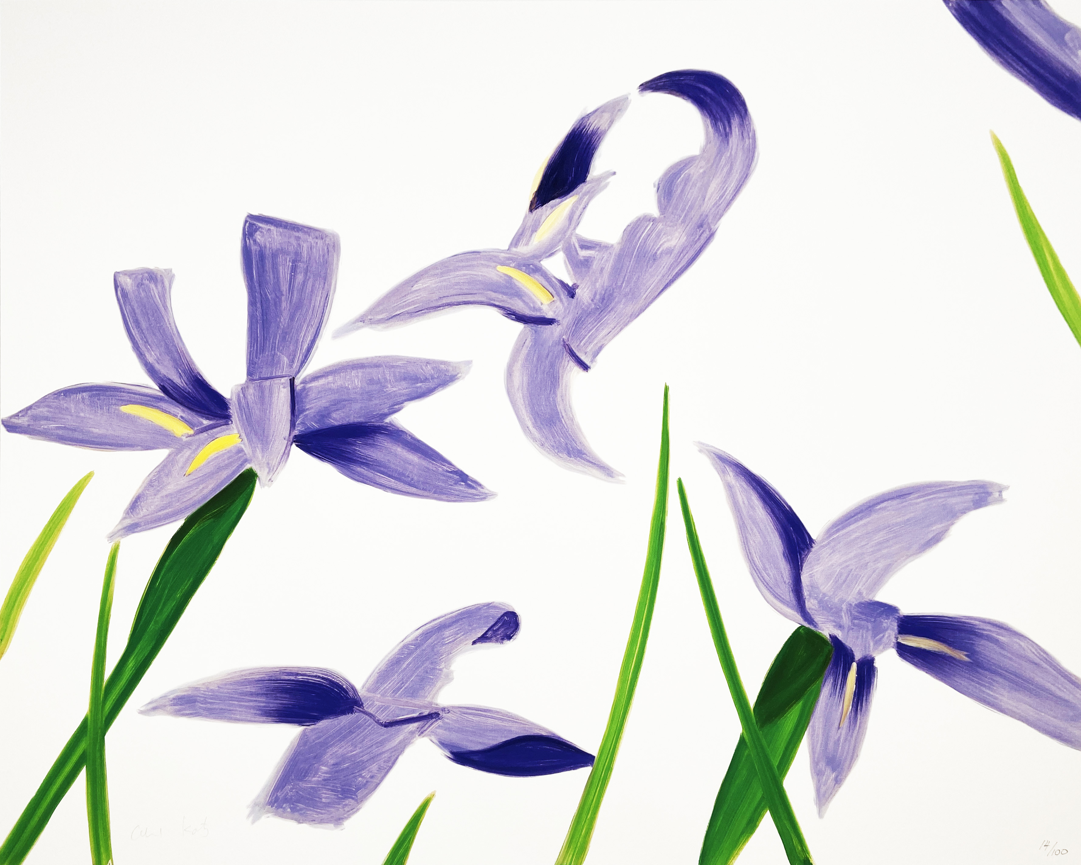 In this 2023 archival pigment print, Katz applies his signature reductive approach to botanical subject matter, distilling the essential forms of purple irises against a stark white ground. The work exemplifies his continued exploration of bold color relationships and simplified compositions, translating his distinctive painterly vision into the medium of fine art printmaking.