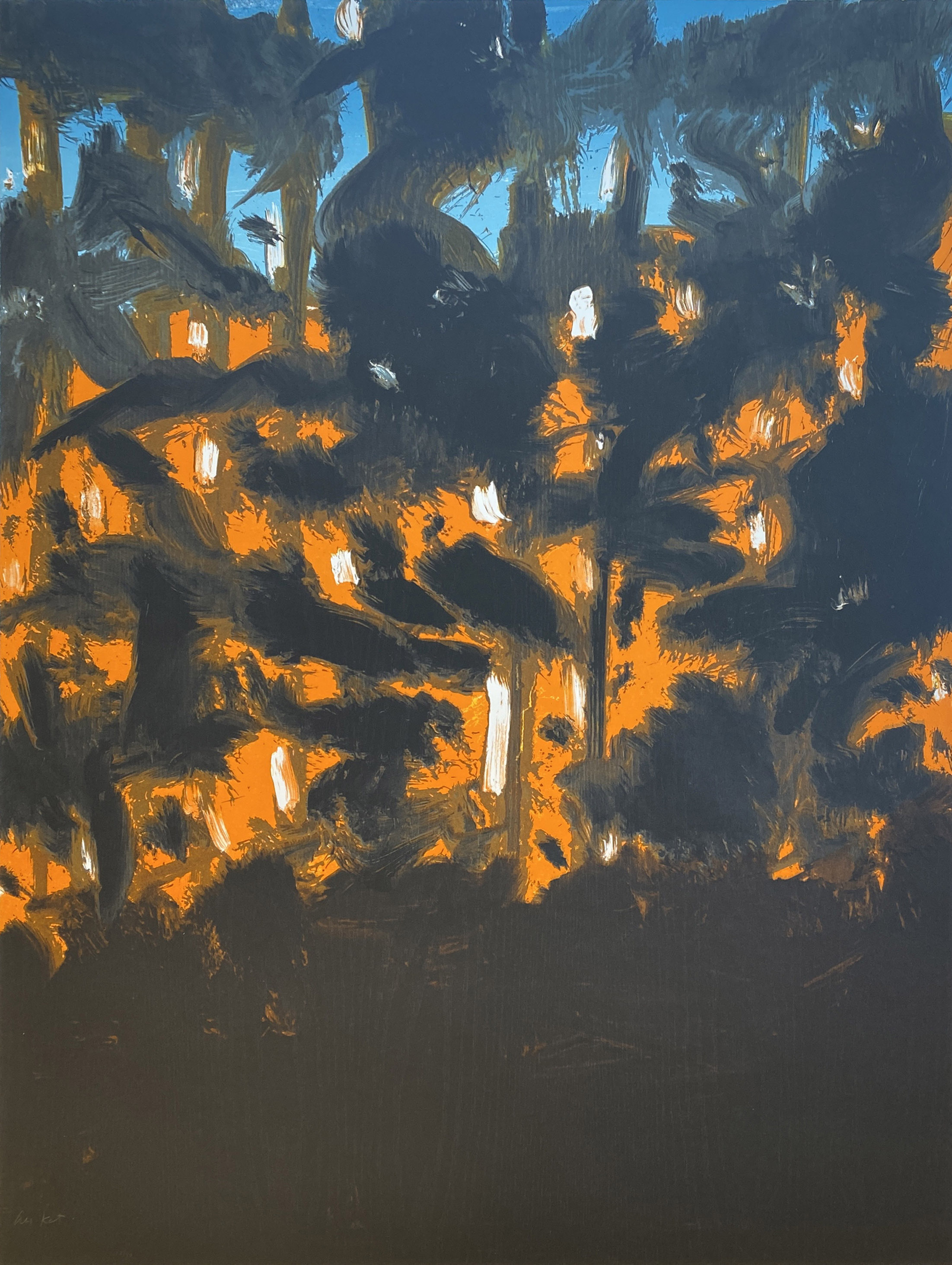 This multi-technique print combines Katz's signature bold, simplified aesthetic with an ambitious six-run process incorporating lithograph, woodcut, and screen print methods. The sunrise subject exemplifies the artist's continued exploration of landscape and light, rendered in his characteristically flat, graphic style that distills natural phenomena into essential forms and colors.