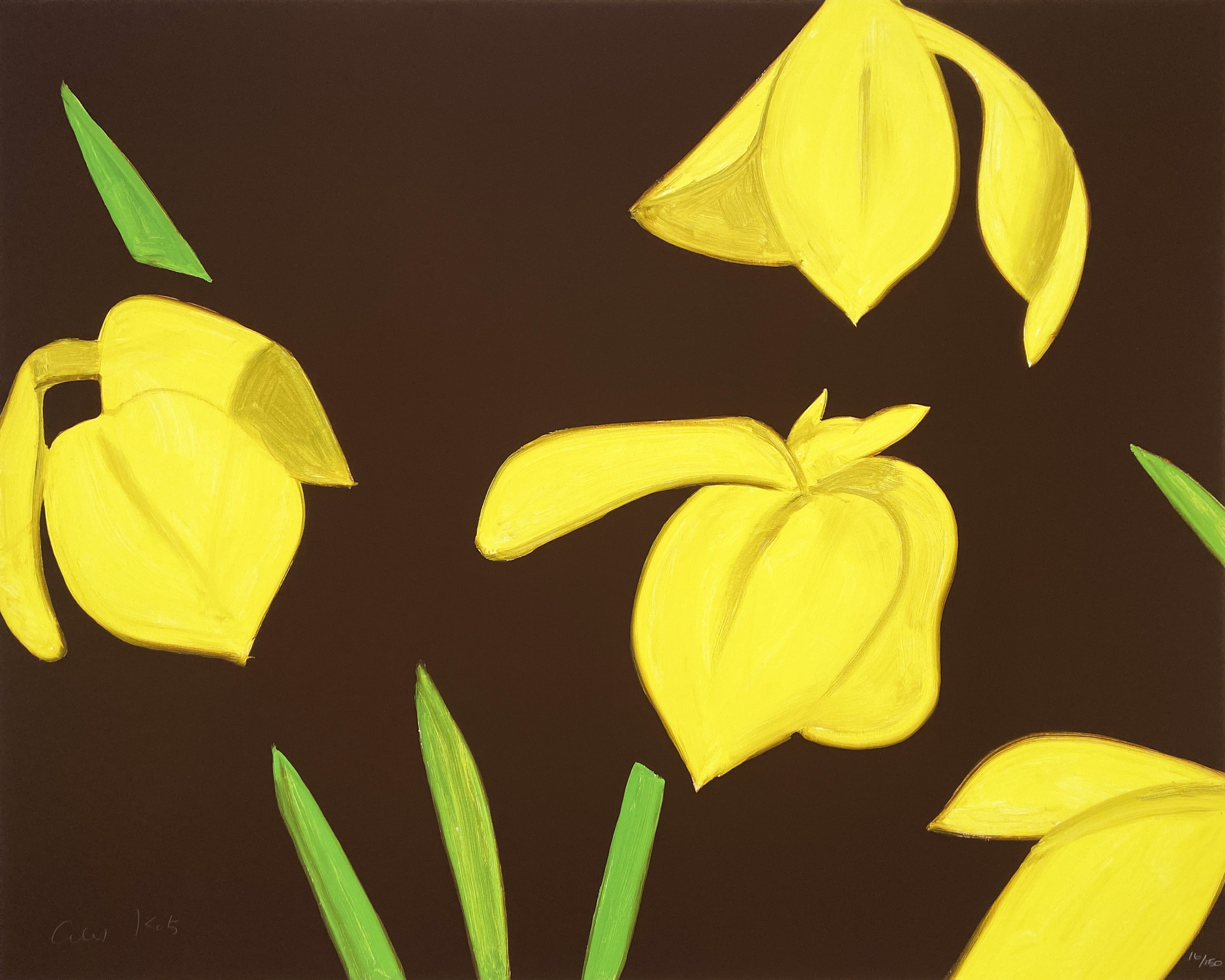 This archival pigment print exemplifies Katz's mastery of bold color relationships and graphic simplicity, featuring his characteristic flat planes of saturated yellow against rich brown grounds. The work demonstrates the artist's continued exploration of essential forms and color interactions that have defined his practice for over six decades.