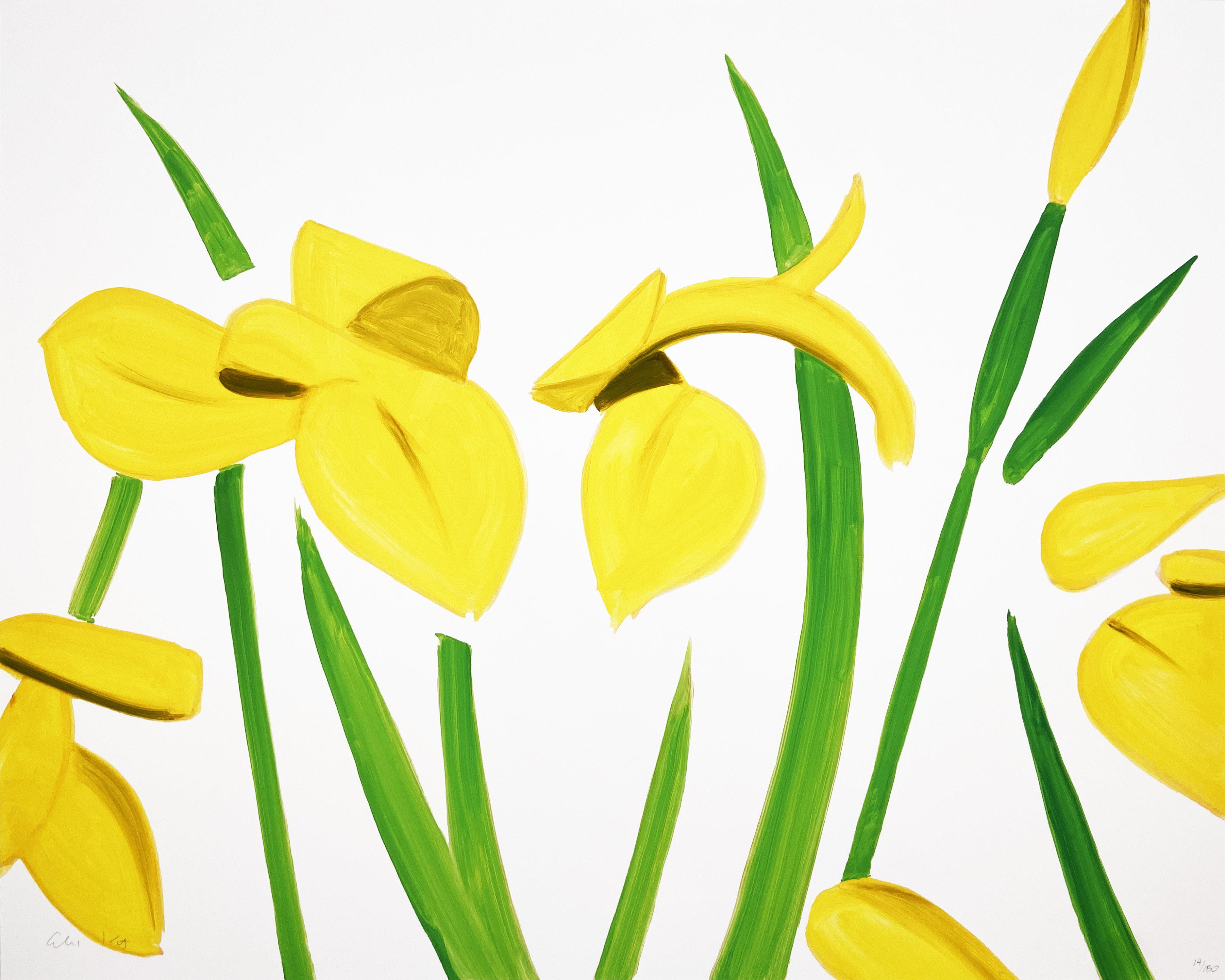 This 2023 archival pigment print exemplifies Katz's signature reductive approach, distilling maritime imagery to essential geometric forms through bold yellow flag motifs against pristine white ground. The work demonstrates the artist's continued exploration of Pop sensibilities and environmental themes, translating his characteristic flat color planes and crisp contours into contemporary printmaking techniques.