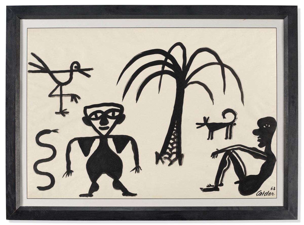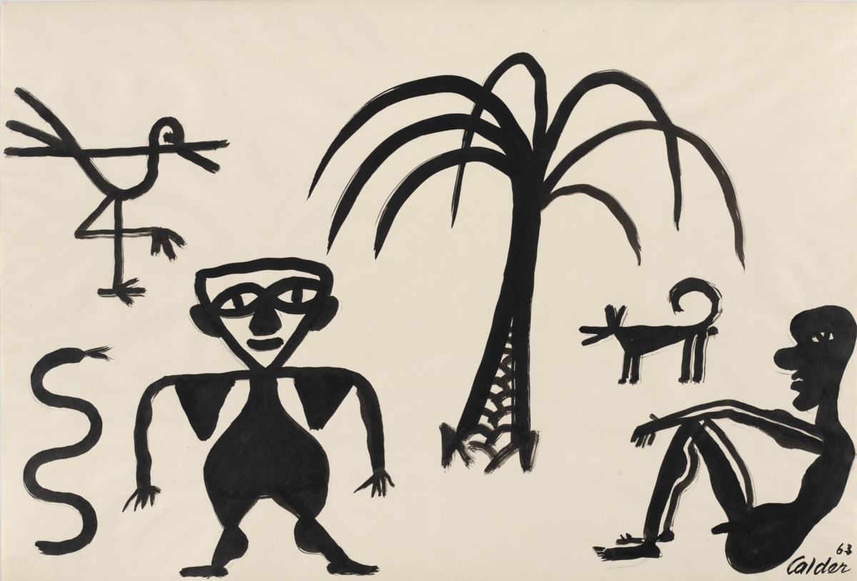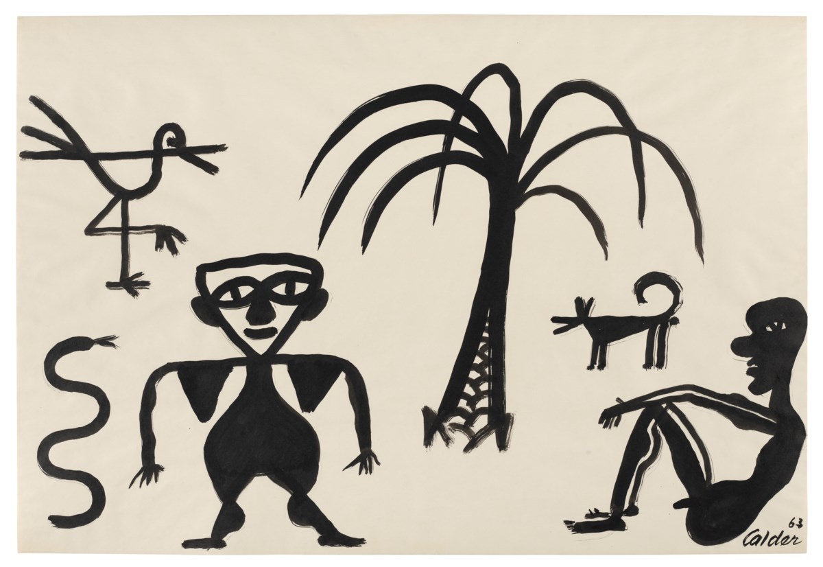 A dynamic composition rendered in bold, gestural ink lines, this drawing showcases Calder's signature playful economy of line to depict simplified human figures alongside a palm tree. The work reflects his characteristic wit and spontaneity, reducing organic forms to their most essential and expressive contours. Calder's confident, fluid strokes bring a sense of lively movement and whimsy to the scene, demonstrating his mastery of drawing as an art form in its own right.