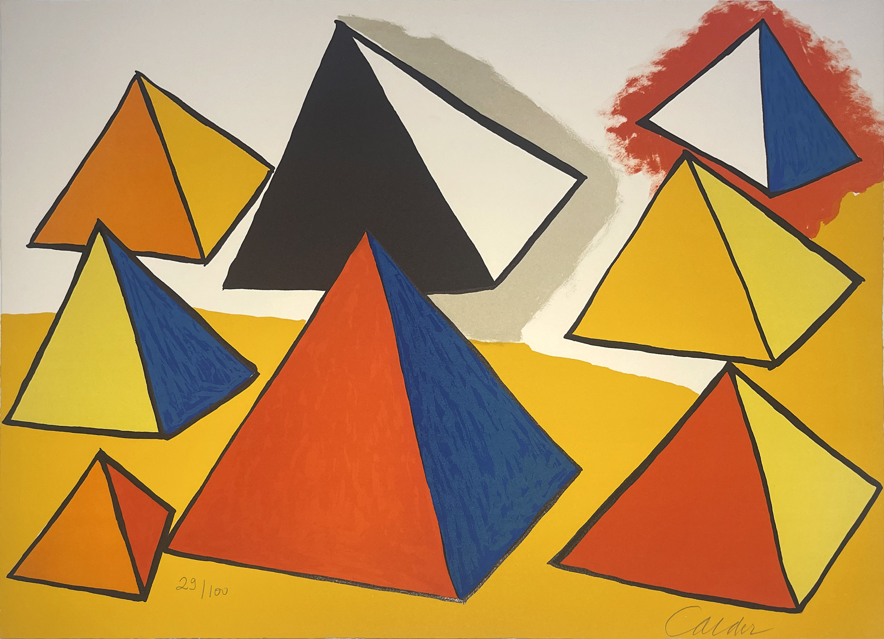 This 1976 lithograph demonstrates Calder's translation of his signature kinetic sculptural vocabulary into the static medium of printmaking, employing bold geometric forms and primary colors that echo the mathematical precision referenced in its tribute to the ancient Greek mathematician. The work exemplifies Calder's late-career exploration of geometric abstraction through the lithographic process.
