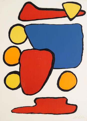 This vibrant 1970 lithograph demonstrates Calder's masterful translation of his signature biomorphic forms and bold color palette from sculpture to printmaking, featuring the artist's characteristic floating abstract shapes rendered in brilliant hues that echo the playful movement and balance found in his celebrated mobiles and stabiles.