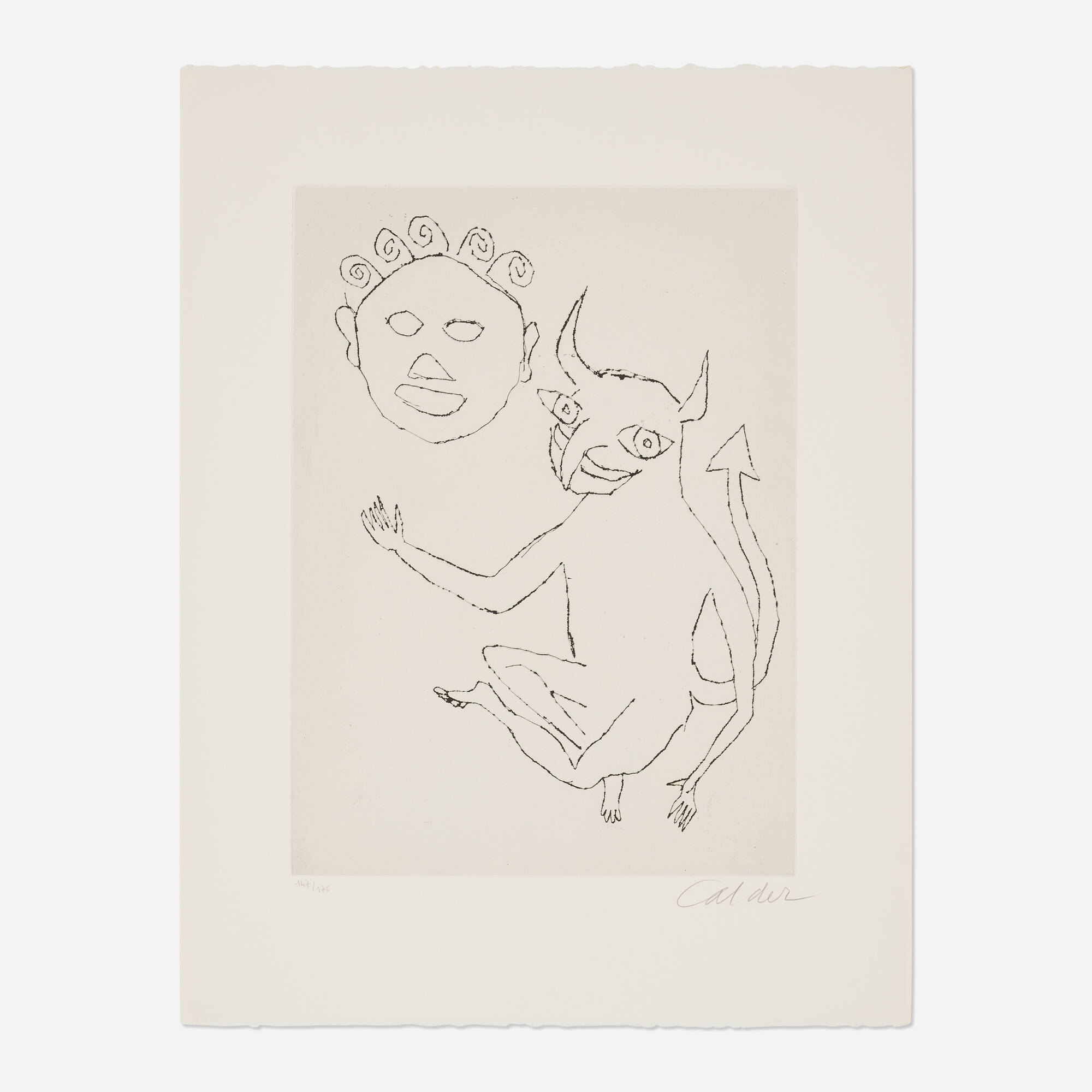 Signed and numbered to lower edge ‘147/175 Calder’. This work is one of nine etchings from the unbound illustrated book Santa Claus by E.E. Cummings and is number 147 from the edition of 175 printed by Maeght, Paris and published by Editions de l'Herne/Collection L'oeil écoute, Paris. Provenance: The Annex Galleries, Santa Rosa, CA | Private Collection