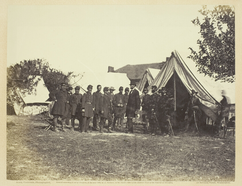 Documenting a pivotal moment in American history, this photograph shows President Lincoln visiting the Antietam battlefield just weeks after the bloody engagement. The image captures Lincoln's tall, contemplative figure among his generals, providing an intimate glimpse of presidential leadership during wartime.