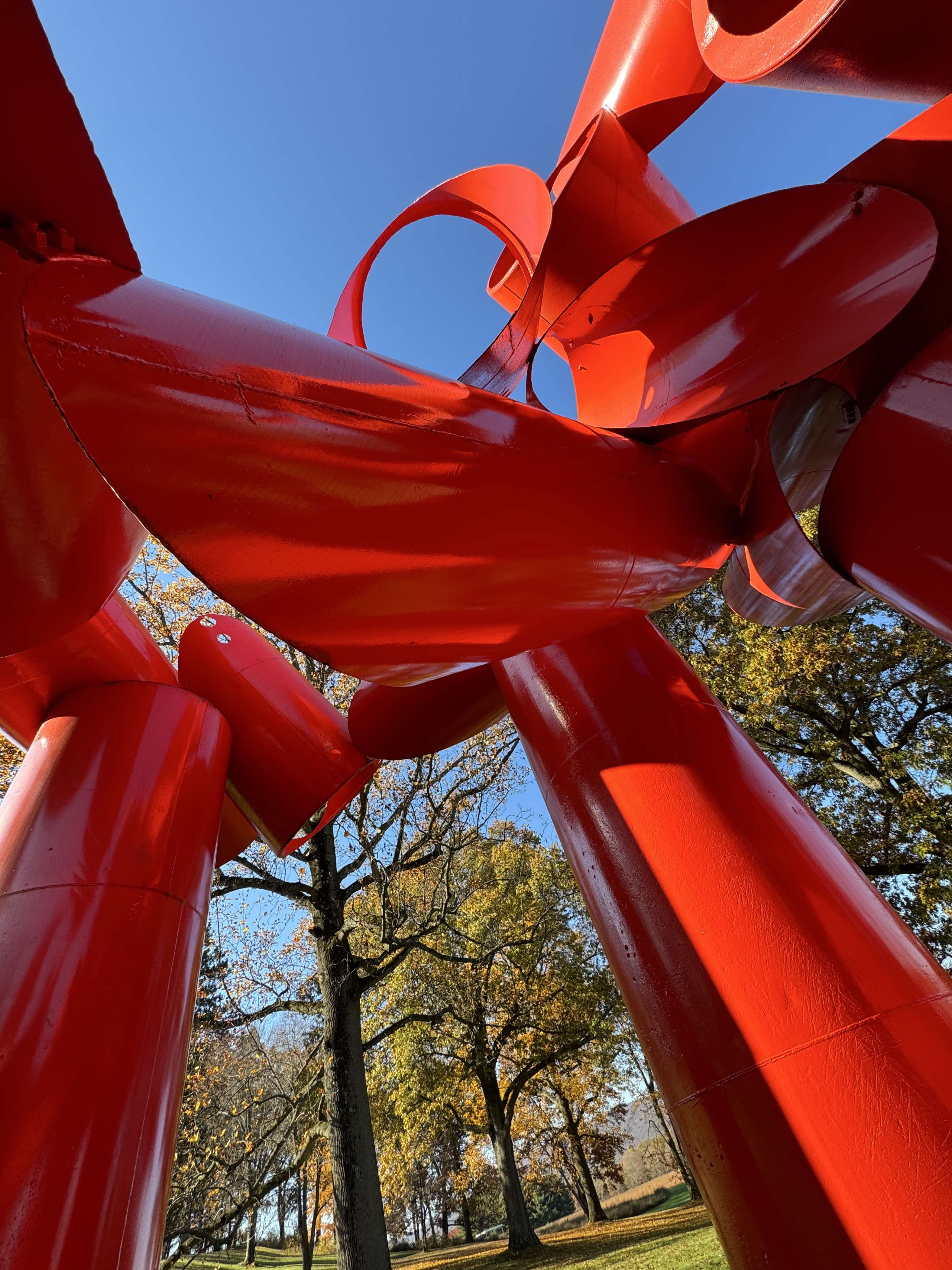 This monumental abstract sculpture by Alexander Liberman is composed of large-scale industrial steel cylinders and sections, bolted together and painted in a vibrant, uniform red. The dynamic, upward-thrusting composition is characteristic of the artist's work, which explores the relationship between industrial forms and organic energy. 'Adam' is a prime example of Liberman's late-career focus on large, outdoor pieces that command their natural surroundings.